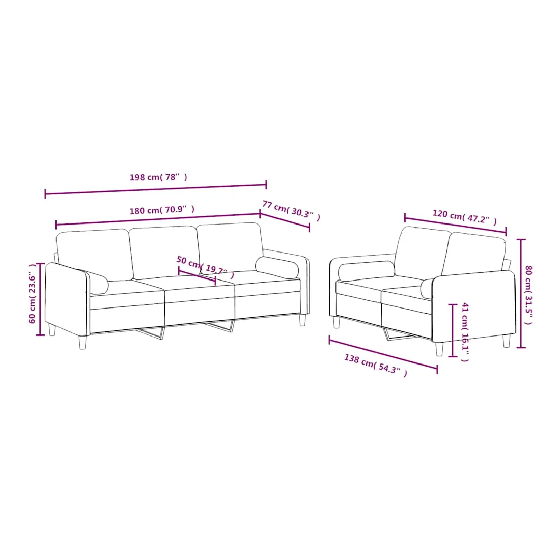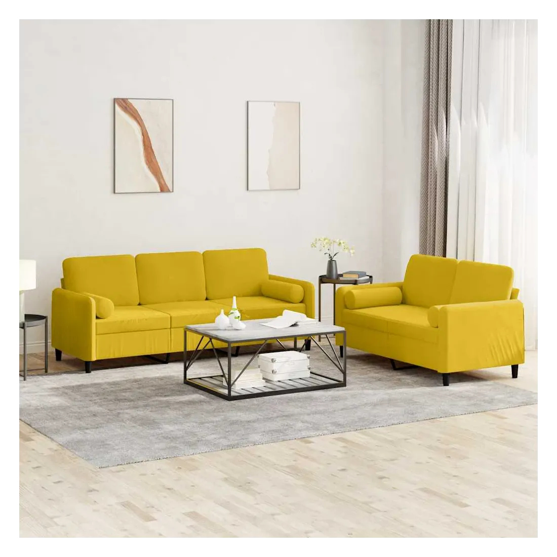 Cet ensemble de canapés est un excellent endroit pour discuter, lire, regarder la télévision ou simplement vous détendre. Il est destiné à être un point central de votre maison. Velours doux : le velours est un tissu doux et confortable, agréable au toucher.Structure robuste et stable : la structure en contreplaqué et en métal du canapé assure robustesse et stabilité.Expérience d'assise confortable : le canapé est très confortable avec le siège, les accoudoirs et les oreillers de dossier bien rembourrés.Oreillers cylindriques pratiques : ces oreillers cylindriques non seulement embellissent votre décor mais ils peuvent également apporter un confort supplémentaire lorsque vous êtes assis ou allongé.