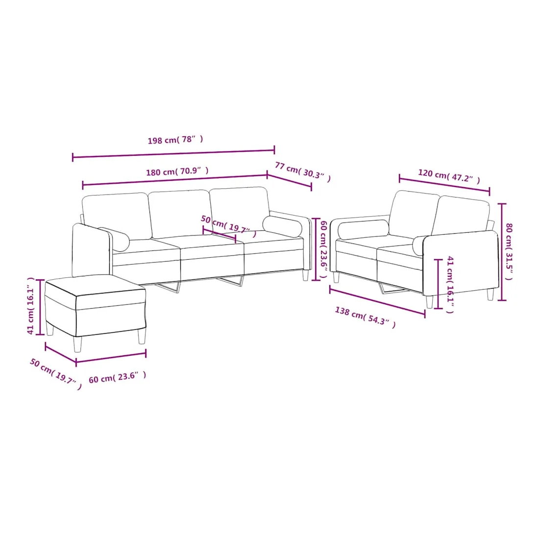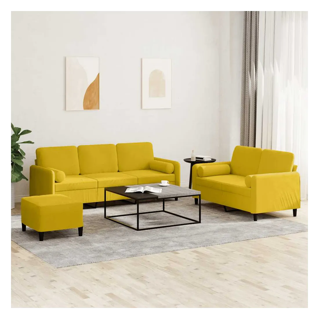 Cet ensemble de canapés est un excellent endroit pour discuter, lire, regarder la télévision ou simplement vous détendre. Il est destiné à être un point central de votre maison. Velours doux : le velours est un tissu doux et confortable, agréable au toucher.Structure robuste et stable : la structure en contreplaqué et en métal du canapé assure robustesse et stabilité.Expérience d'assise confortable : le canapé est très confortable avec le siège, les accoudoirs et les oreillers de dossier bien rembourrés.Oreillers cylindriques pratiques : ces oreillers cylindriques non seulement embellissent votre décor mais ils peuvent également apporter un confort supplémentaire lorsque vous êtes assis ou allongé.Pouf polyvalent : ce repose-pied convient pour reposer vos pieds lorsque vous êtes allongé dans un canapé ou pour vous offrir un siège supplémentaire dans votre pièce. De plus, le design simple et la taille compacte le rendent idéal pour presque tous vos espaces de vie.