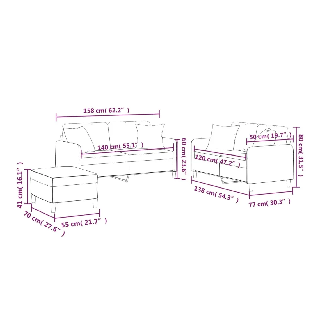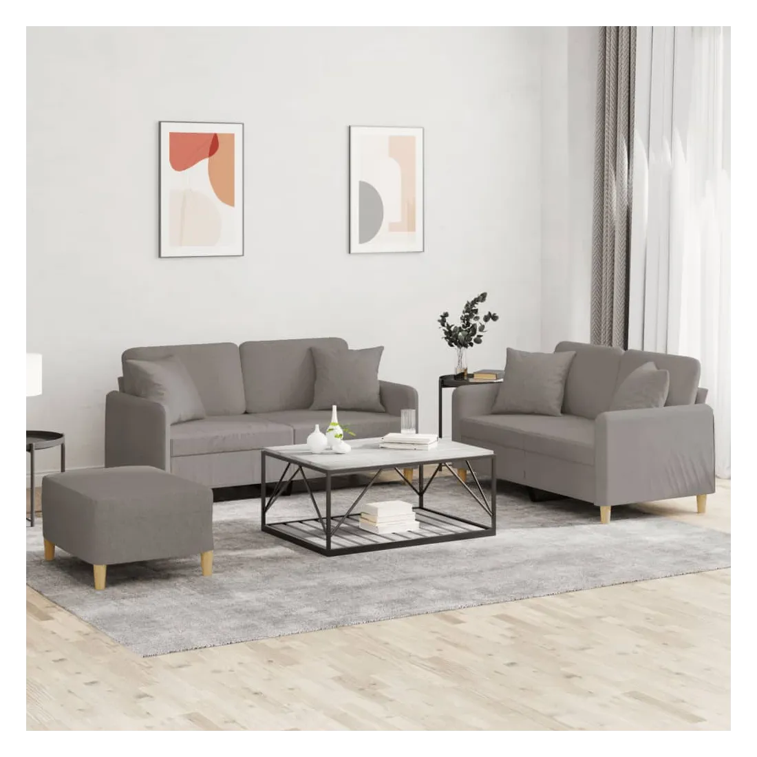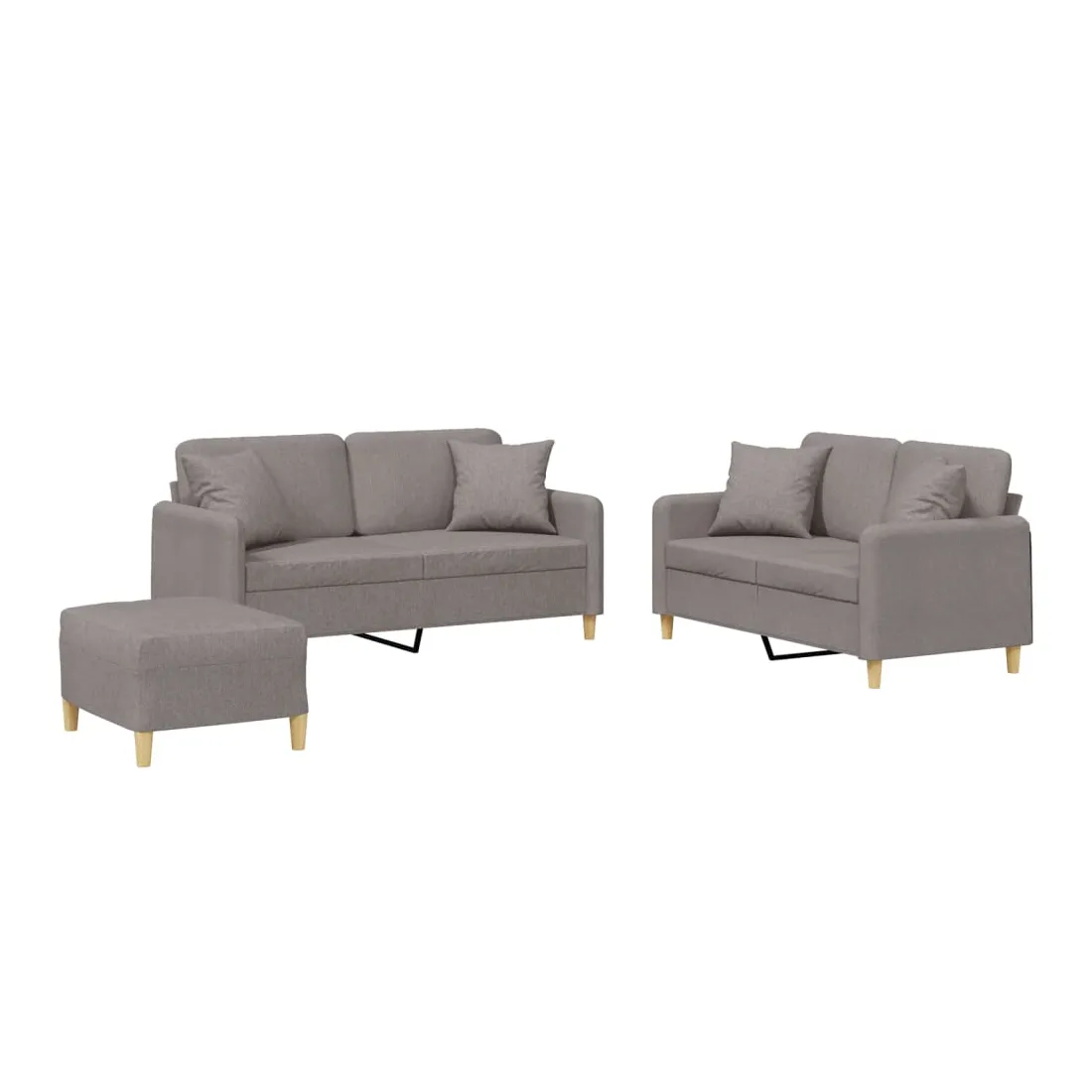 Cet ensemble de canapés est un excellent endroit pour discuter, lire, regarder la télévision ou simplement vous détendre. Il est destiné à être un point central de votre maison. Tissu durable : le tissu présente un aspect simple et épuré tout en restant respirant et durable.Structure robuste et stable : la structure en contreplaqué et en métal du canapé assure robustesse et stabilité.Expérience d'assise confortable : le canapé est très confortable avec le siège, les accoudoirs et les coussins de dossier bien rembourrés.Oreillers de canapé pratiques : ces oreillers décoratifs carrés non seulement embellissent votre décor mais ils peuvent également apporter un confort supplémentaire lorsque vous êtes assis ou allongé.Pouf polyvalent : ce repose-pied convient pour reposer vos pieds lorsque vous êtes allongé dans un canapé ou pour vous offrir un siège supplémentaire dans votre pièce. De plus, le design simple et la taille compacte le rendent idéal pour presque tous vos espaces de vie.