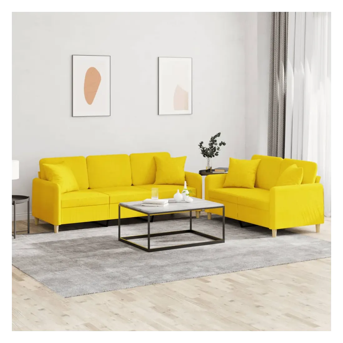 Cet ensemble de canapés est un excellent endroit pour discuter, lire, regarder la télévision ou simplement vous détendre. Il est destiné à être un point central de votre maison. Tissu durable : le tissu présente un aspect simple et épuré tout en restant respirant et durable.Structure robuste et stable : la structure en contreplaqué et en métal du canapé assure robustesse et stabilité.Expérience d'assise confortable : le canapé est très confortable avec le siège, les accoudoirs et les coussins de dossier bien rembourrés.Oreillers de canapé pratiques : ces oreillers décoratifs carrés non seulement embellissent votre décor mais ils peuvent également apporter un confort supplémentaire lorsque vous êtes assis ou allongé.