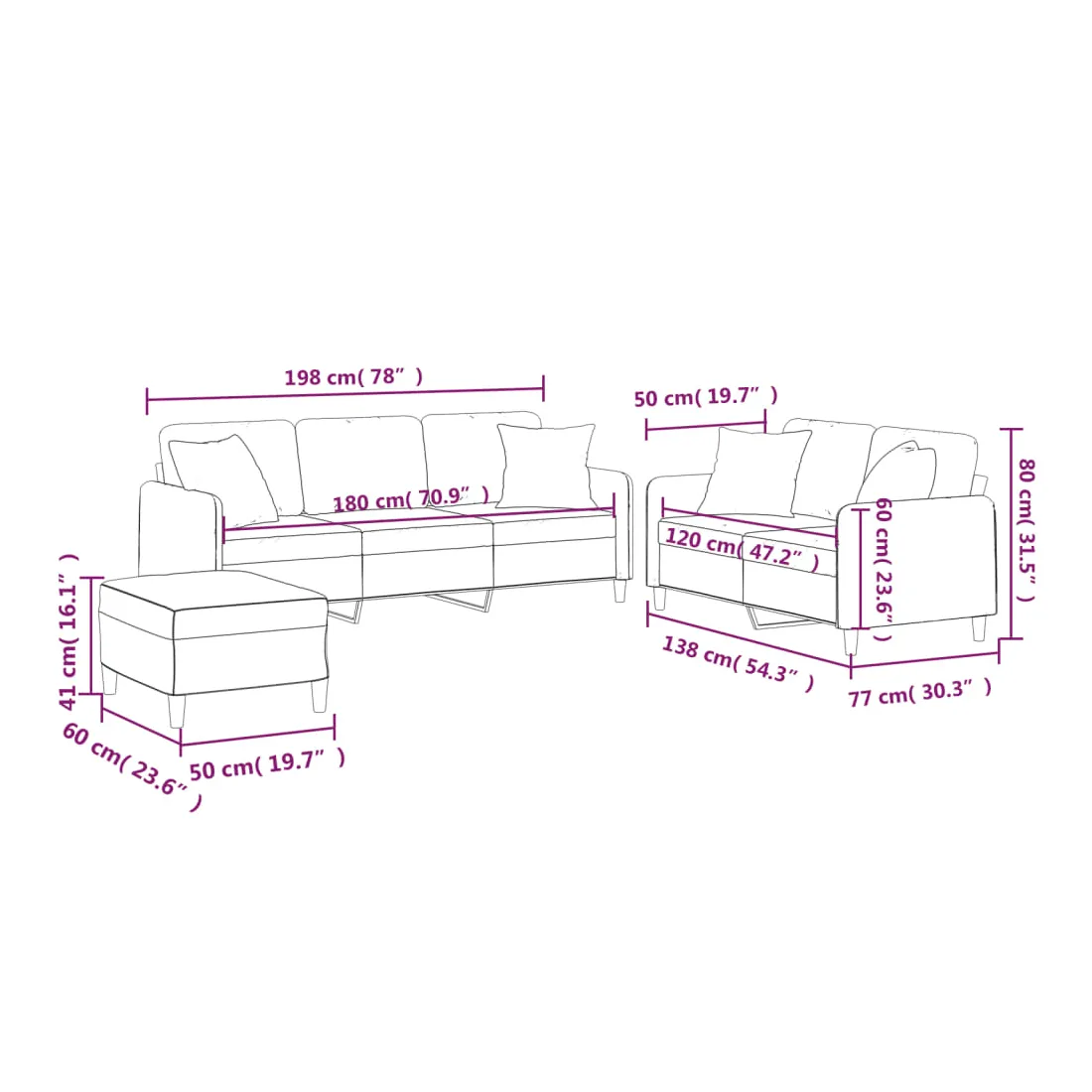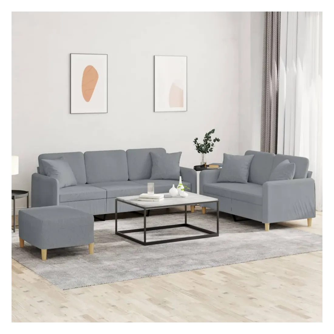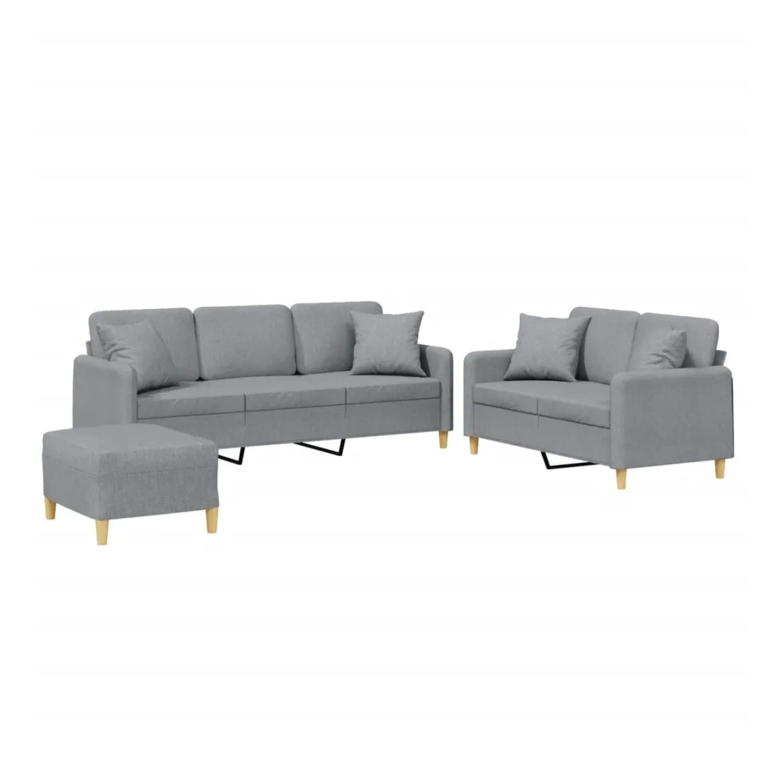 Cet ensemble de canapés est un excellent endroit pour discuter, lire, regarder la télévision ou simplement vous détendre. Il est destiné à être un point central de votre maison. Tissu durable : le tissu présente un aspect simple et épuré tout en restant respirant et durable.Structure robuste et stable : la structure en contreplaqué et en métal du canapé assure robustesse et stabilité.Expérience d'assise confortable : le canapé est très confortable avec le siège, les accoudoirs et les oreillers de dossier bien rembourrés.Oreillers de canapé pratiques : ces oreillers décoratifs carrés non seulement embellissent votre décor mais ils peuvent également apporter un confort supplémentaire lorsque vous êtes assis ou allongé.Pouf polyvalent : ce repose-pied convient pour reposer vos pieds lorsque vous êtes allongé dans un canapé ou pour vous offrir un siège supplémentaire dans votre pièce. De plus, le design simple et la taille compacte le rendent idéal pour presque tous vos espaces de vie.