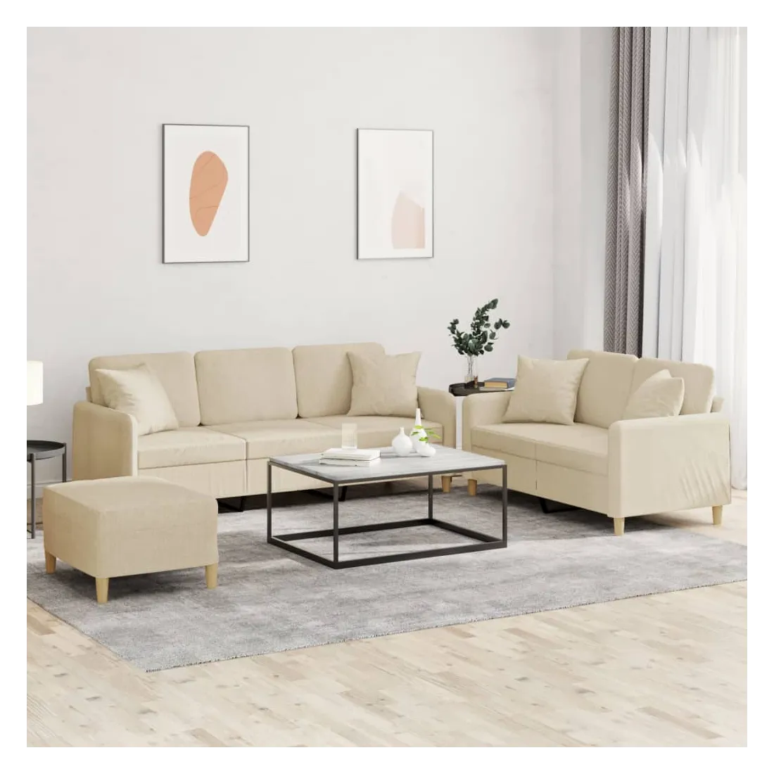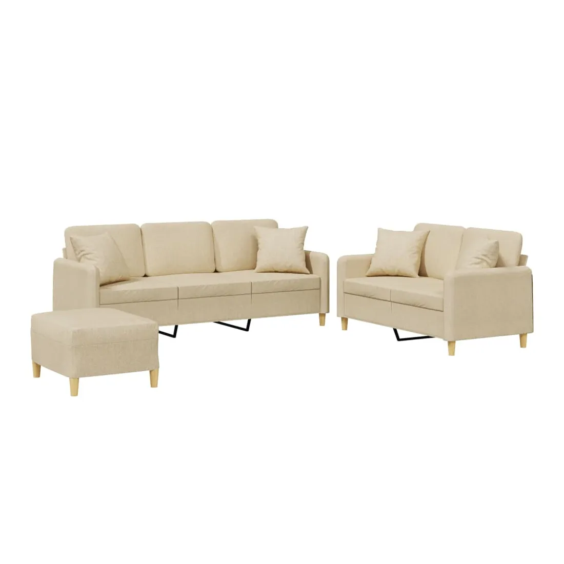 Cet ensemble de canapés est un excellent endroit pour discuter, lire, regarder la télévision ou simplement vous détendre. Il est destiné à être un point central de votre maison. Tissu durable : le tissu présente un aspect simple et épuré tout en restant respirant et durable.Structure robuste et stable : la structure en contreplaqué et en métal du canapé assure robustesse et stabilité.Expérience d'assise confortable : le canapé est très confortable avec le siège, les accoudoirs et les oreillers de dossier bien rembourrés.Oreillers de canapé pratiques : ces oreillers décoratifs carrés non seulement embellissent votre décor mais ils peuvent également apporter un confort supplémentaire lorsque vous êtes assis ou allongé.Pouf polyvalent : ce repose-pied convient pour reposer vos pieds lorsque vous êtes allongé dans un canapé ou pour vous offrir un siège supplémentaire dans votre pièce. De plus, le design simple et la taille compacte le rendent idéal pour presque tous vos espaces de vie.