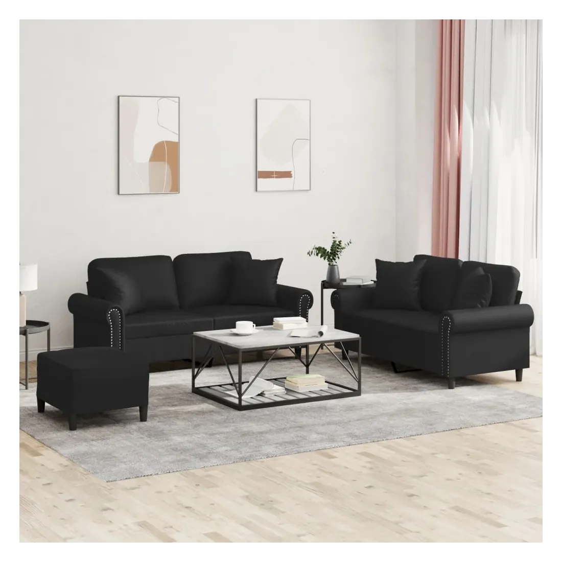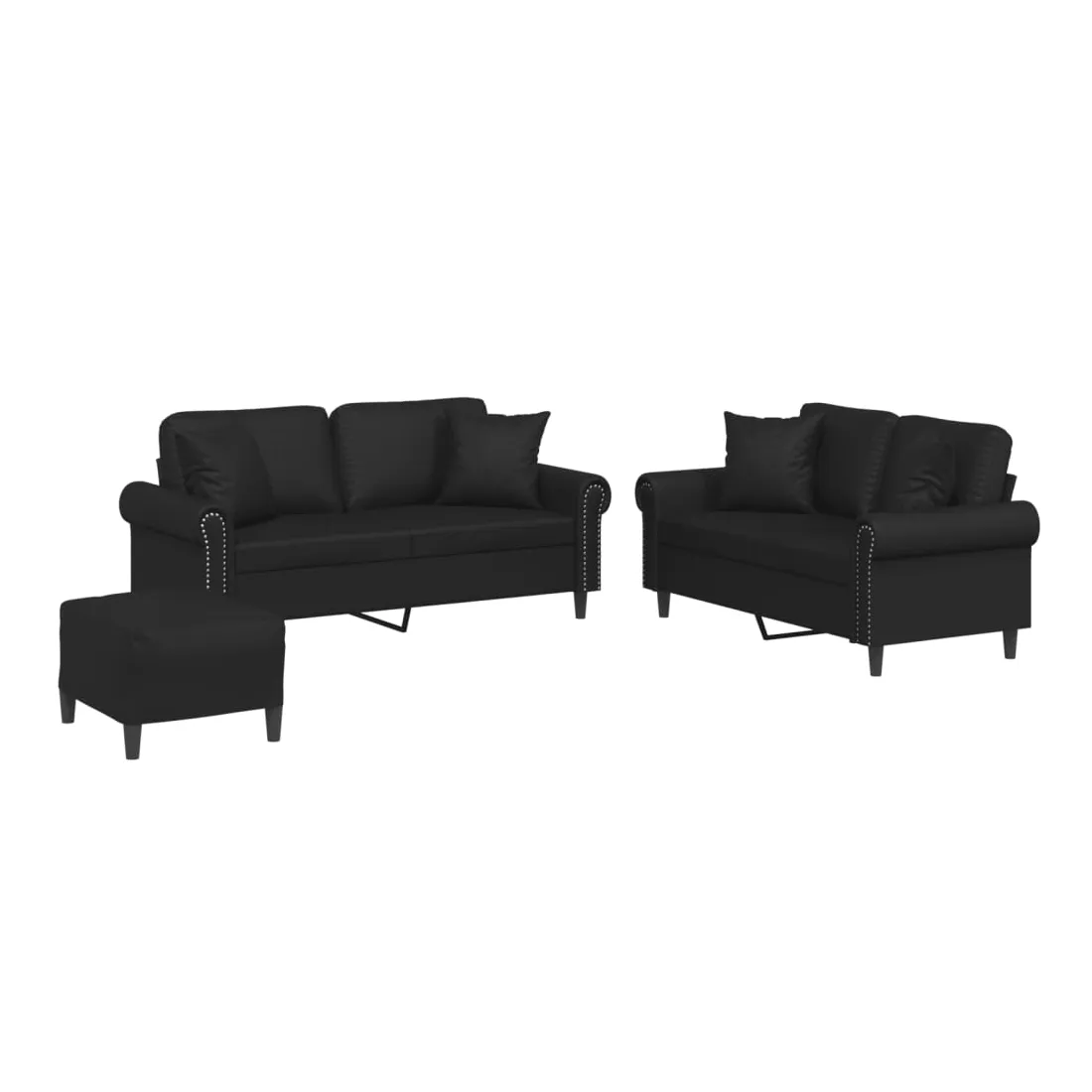 Cet ensemble de canapés est un excellent endroit pour discuter, lire, regarder la télévision ou simplement vous détendre. Il est destiné à être un point central de votre maison. Similicuir durable : le similicuir est un matériau très durable. Il est résistant aux taches, ce qui le rend facile à nettoyer avec un chiffon humide. La surface lisse donne également un aspect luxueux et la beauté du cuir véritable.Structure robuste et stable : la structure en contreplaqué et en métal du canapé assure robustesse et stabilité.Expérience d'assise confortable : le canapé est très confortable avec le siège, les accoudoirs et les oreillers de dossier bien rembourrés.Oreillers de canapé pratiques : ces oreillers décoratifs carrés non seulement embellissent votre décor mais ils peuvent également apporter un confort supplémentaire lorsque vous êtes assis ou allongé.Pouf polyvalent : ce repose-pied convient pour reposer vos pieds lorsque vous êtes allongé dans un canapé ou pour vous offrir un siège supplémentaire dans votre pièce. De plus, le design simple et la taille compacte le rendent idéal pour presque tous vos espaces de vie.