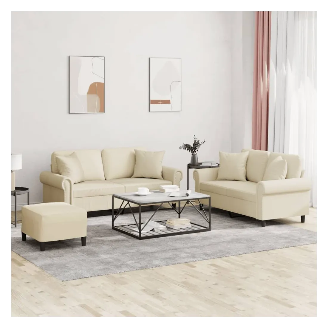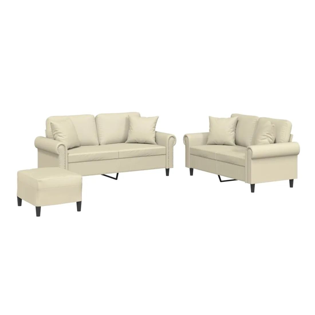 Cet ensemble de canapés est un excellent endroit pour discuter, lire, regarder la télévision ou simplement vous détendre. Il est destiné à être un point central de votre maison. Similicuir durable : le similicuir est un matériau très durable. Il est résistant aux taches, ce qui le rend facile à nettoyer avec un chiffon humide. La surface lisse donne également un aspect luxueux et la beauté du cuir véritable.Structure robuste et stable : la structure en contreplaqué et en métal du canapé assure robustesse et stabilité.Expérience d'assise confortable : le canapé est très confortable avec le siège, les accoudoirs et les oreillers de dossier bien rembourrés.Oreillers de canapé pratiques : ces oreillers décoratifs carrés non seulement embellissent votre décor mais ils peuvent également apporter un confort supplémentaire lorsque vous êtes assis ou allongé.Pouf polyvalent : ce repose-pied convient pour reposer vos pieds lorsque vous êtes allongé dans un canapé ou pour vous offrir un siège supplémentaire dans votre pièce. De plus, le design simple et la taille compacte le rendent idéal pour presque tous vos espaces de vie.