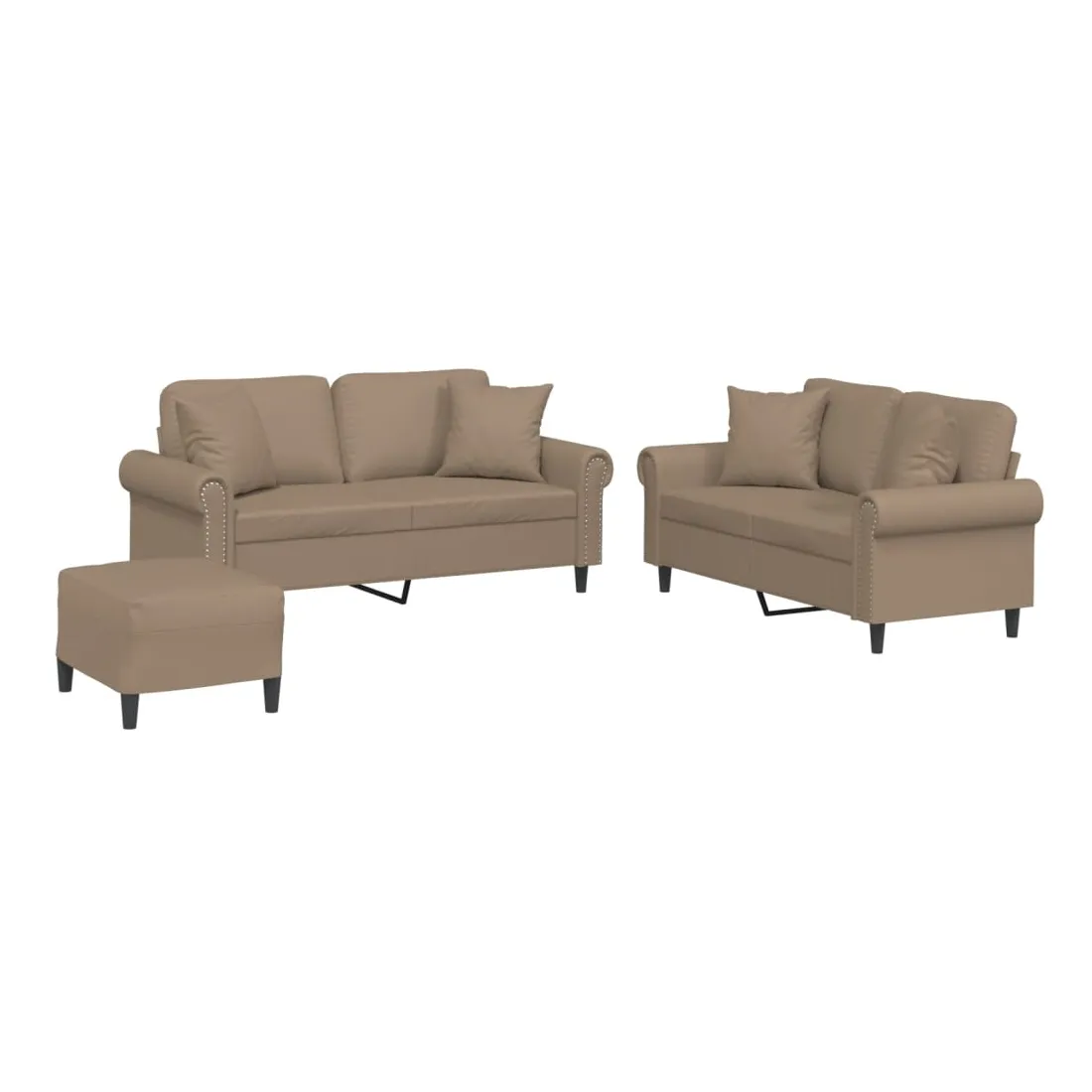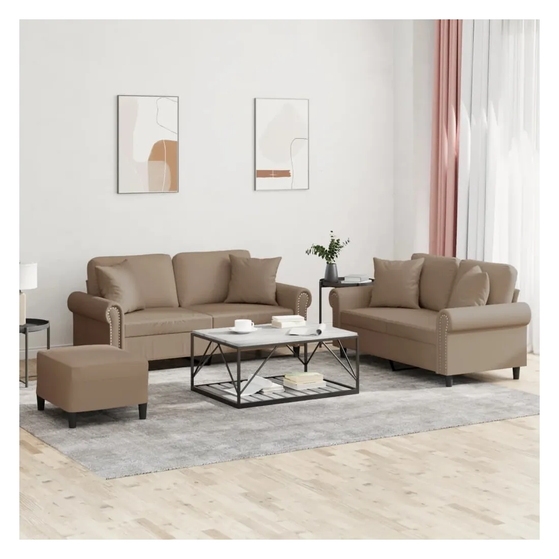 Cet ensemble de canapés est un excellent endroit pour discuter, lire, regarder la télévision ou simplement vous détendre. Il est destiné à être un point central de votre maison. Similicuir durable : le similicuir est un matériau très durable. Il est résistant aux taches, ce qui le rend facile à nettoyer avec un chiffon humide. La surface lisse donne également un aspect luxueux et la beauté du cuir véritable.Structure robuste et stable : la structure en contreplaqué et en métal du canapé assure robustesse et stabilité.Expérience d'assise confortable : le canapé est très confortable avec le siège, les accoudoirs et les oreillers de dossier bien rembourrés.Oreillers de canapé pratiques : ces oreillers décoratifs carrés non seulement embellissent votre décor mais ils peuvent également apporter un confort supplémentaire lorsque vous êtes assis ou allongé.Pouf polyvalent : ce repose-pied convient pour reposer vos pieds lorsque vous êtes allongé dans un canapé ou pour vous offrir un siège supplémentaire dans votre pièce. De plus, le design simple et la taille compacte le rendent idéal pour presque tous vos espaces de vie.