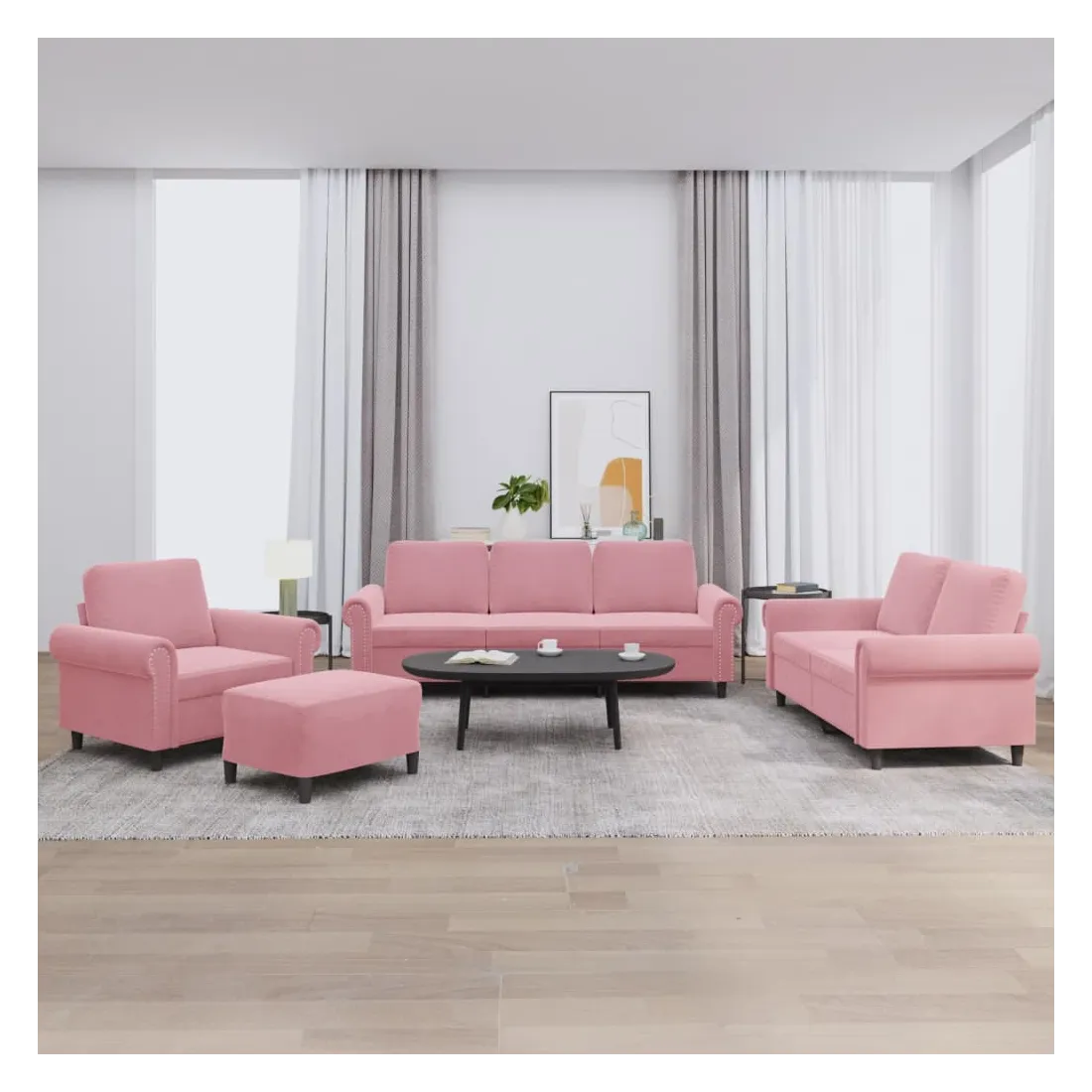 Cet ensemble de canapés est un excellent endroit pour discuter, lire, regarder la télévision ou simplement vous détendre. Il est destiné à être un point central de votre maison. Velours doux : le velours est un tissu doux et confortable, agréable au toucher.Structure robuste et stable : la structure en contreplaqué et en métal du canapé assure robustesse et stabilité.Expérience d'assise confortable : le canapé est très confortable avec le siège, les accoudoirs et les oreillers de dossier bien rembourrés.Pouf polyvalent : ce repose-pied convient pour reposer vos pieds lorsque vous êtes allongé dans un canapé ou pour vous offrir un siège supplémentaire dans votre pièce. De plus, le design simple et la taille compacte le rendent idéal pour presque tous vos espaces de vie.