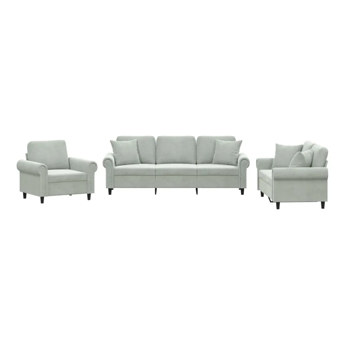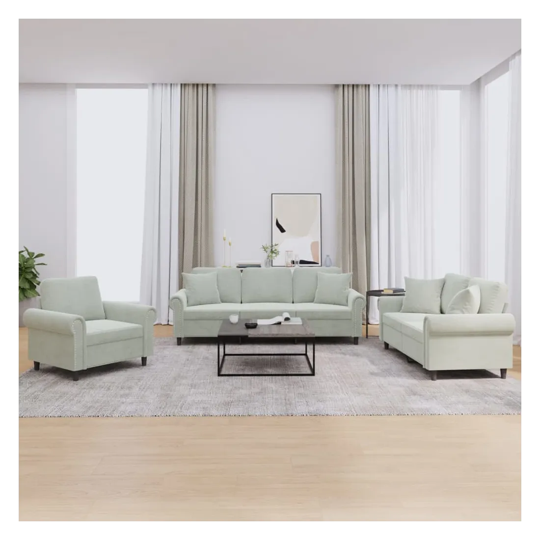 Cet ensemble de canapés est un excellent endroit pour discuter, lire, regarder la télévision ou simplement vous détendre. Il est destiné à être un point central de votre maison. Velours doux : le velours est un tissu doux et confortable, agréable au toucher.Structure robuste et stable : la structure en contreplaqué et en métal du canapé assure robustesse et stabilité.Expérience d'assise confortable : le canapé est très confortable avec le siège, les accoudoirs et les oreillers de dossier bien rembourrés.Oreillers de canapé pratiques : ces oreillers décoratifs carrés non seulement embellissent votre décor mais ils peuvent également apporter un confort supplémentaire lorsque vous êtes assis ou allongé.