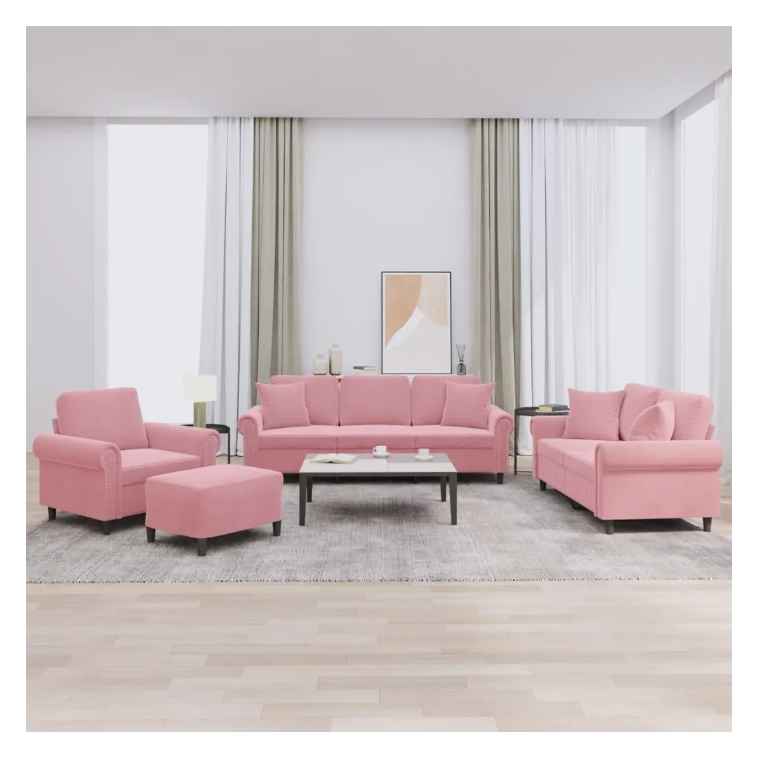 Cet ensemble de canapés est un excellent endroit pour discuter, lire, regarder la télévision ou simplement vous détendre. Il est destiné à être un point central de votre maison. Velours doux : le velours est un tissu doux et confortable, agréable au toucher.Structure robuste et stable : la structure en contreplaqué et en métal du canapé assure robustesse et stabilité.Expérience d'assise confortable : le canapé est très confortable avec le siège, les accoudoirs et les oreillers de dossier bien rembourrés.Oreillers de canapé pratiques : ces oreillers décoratifs carrés non seulement embellissent votre décor mais ils peuvent également apporter un confort supplémentaire lorsque vous êtes assis ou allongé.Pouf polyvalent : ce repose-pied convient pour reposer vos pieds lorsque vous êtes allongé dans un canapé ou pour vous offrir un siège supplémentaire dans votre pièce. De plus, le design simple et la taille compacte le rendent idéal pour presque tous vos espaces de vie.