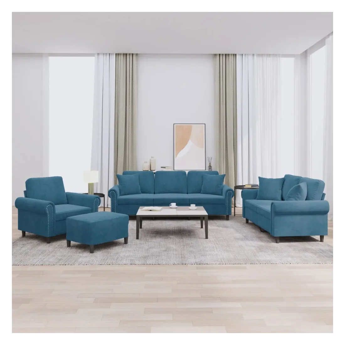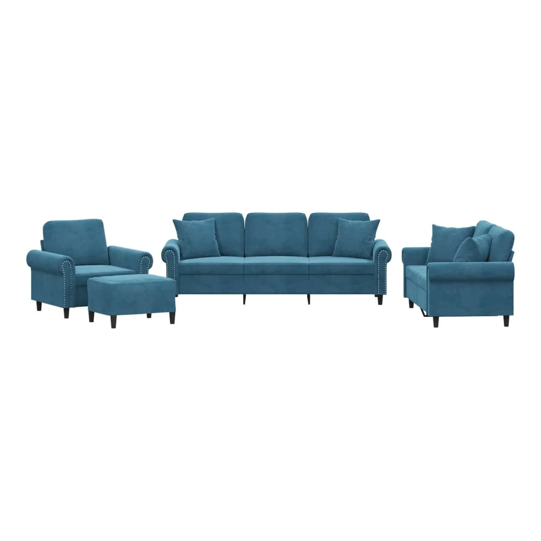 vidaXLCet ensemble de canapés est un excellent endroit pour discuter, lire, regarder la télévision ou simplement vous détendre. Il est destiné à être un point central de votre maison. Velours doux : le velours est un tissu doux et confortable, agréable au toucher.Structure robuste et stable : la structure en contreplaqué et en métal du canapé assure robustesse et stabilité.Expérience d'assise confortable : le canapé est très confortable avec le siège, les accoudoirs et les oreillers de dossier bien rembourrés.Oreillers de canapé pratiques : ces oreillers décoratifs carrés non seulement embellissent votre décor mais ils peuvent également apporter un confort supplémentaire lorsque vous êtes assis ou allongé.Pouf polyvalent : ce repose-pied convient pour reposer vos pieds lorsque vous êtes allongé dans un canapé ou pour vous offrir un siège supplémentaire dans votre pièce. De plus, le design simple et la taille compacte le rendent idéal pour presque tous vos espaces de vie.