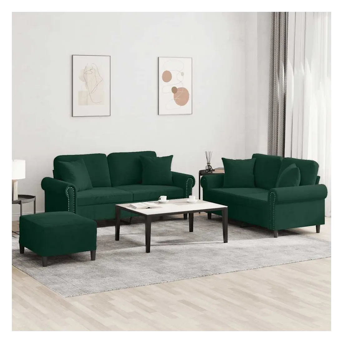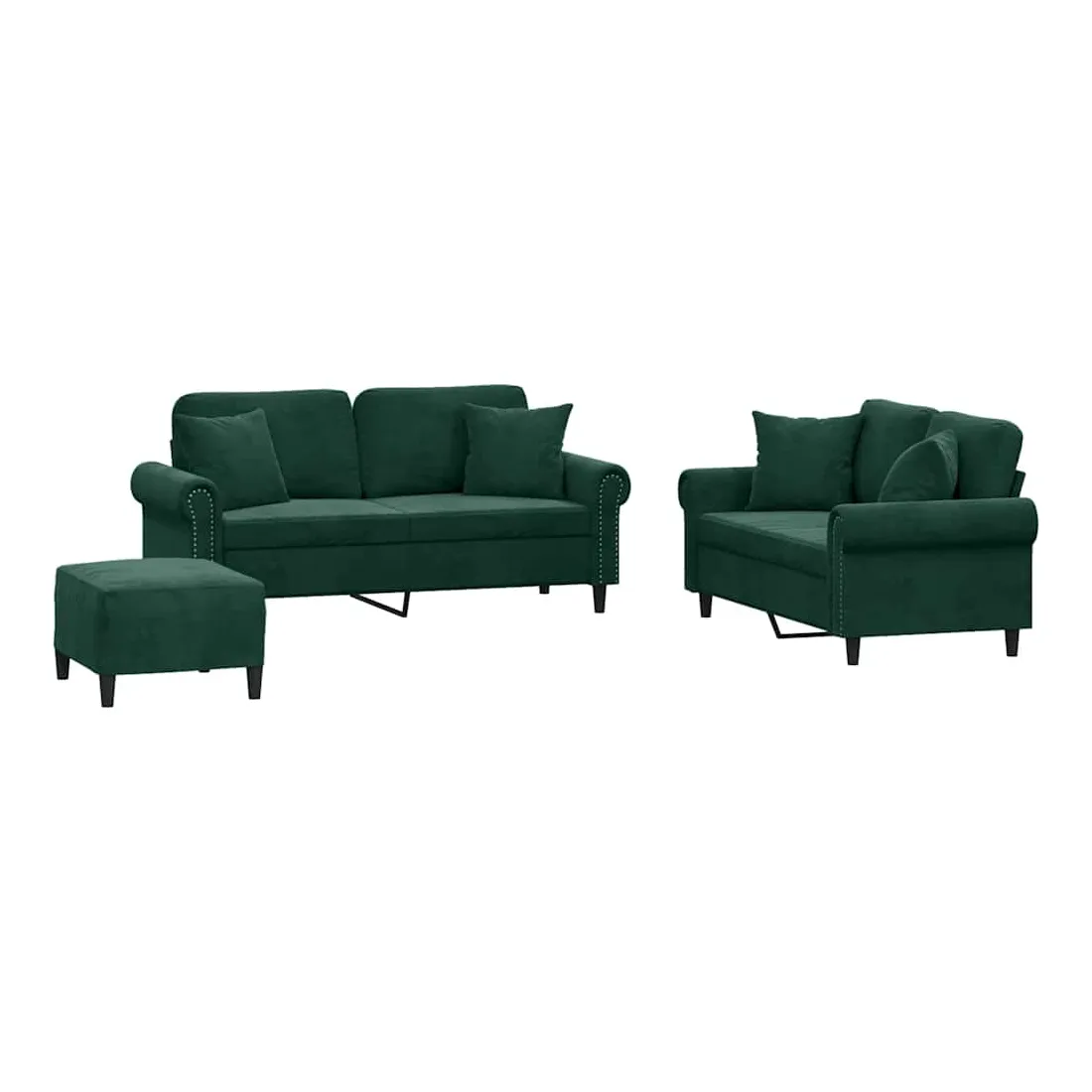 Cet ensemble de canapés est un excellent endroit pour discuter, lire, regarder la télévision ou simplement vous détendre. Il est destiné à être un point central de votre maison. Velours doux : le velours est un tissu doux et confortable, agréable au toucher.Structure robuste et stable : la structure en contreplaqué et en métal du canapé assure robustesse et stabilité.Expérience d'assise confortable : le canapé est très confortable avec le siège, les accoudoirs et les oreillers de dossier bien rembourrés.Oreillers de canapé pratiques : ces oreillers décoratifs carrés non seulement embellissent votre décor mais ils peuvent également apporter un confort supplémentaire lorsque vous êtes assis ou allongé.Pouf polyvalent : ce repose-pied convient pour reposer vos pieds lorsque vous êtes allongé dans un canapé, ou pour vous offrir un siège supplémentaire dans votre pièce. De plus, le design simple et la taille compacte le rendent idéal pour presque tous vos espaces de vie.