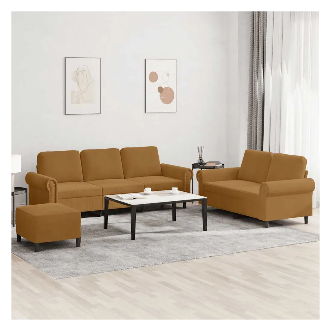 Cet ensemble de canapés est un excellent endroit pour discuter, lire, regarder la télévision ou simplement vous détendre. Il est destiné à être un point central de votre maison. Velours doux : le velours est un tissu doux et confortable, agréable au toucher.Structure robuste et stable : la structure en contreplaqué et en métal du canapé assure robustesse et stabilité.Expérience d'assise confortable : le canapé est très confortable avec le siège, les accoudoirs et les oreillers de dossier bien rembourrés.Pouf polyvalent : ce repose-pied convient pour reposer vos pieds lorsque vous êtes allongé dans un canapé, ou pour vous offrir un siège supplémentaire dans votre pièce. De plus, le design simple et la taille compacte le rendent idéal pour presque tous vos espaces de vie.