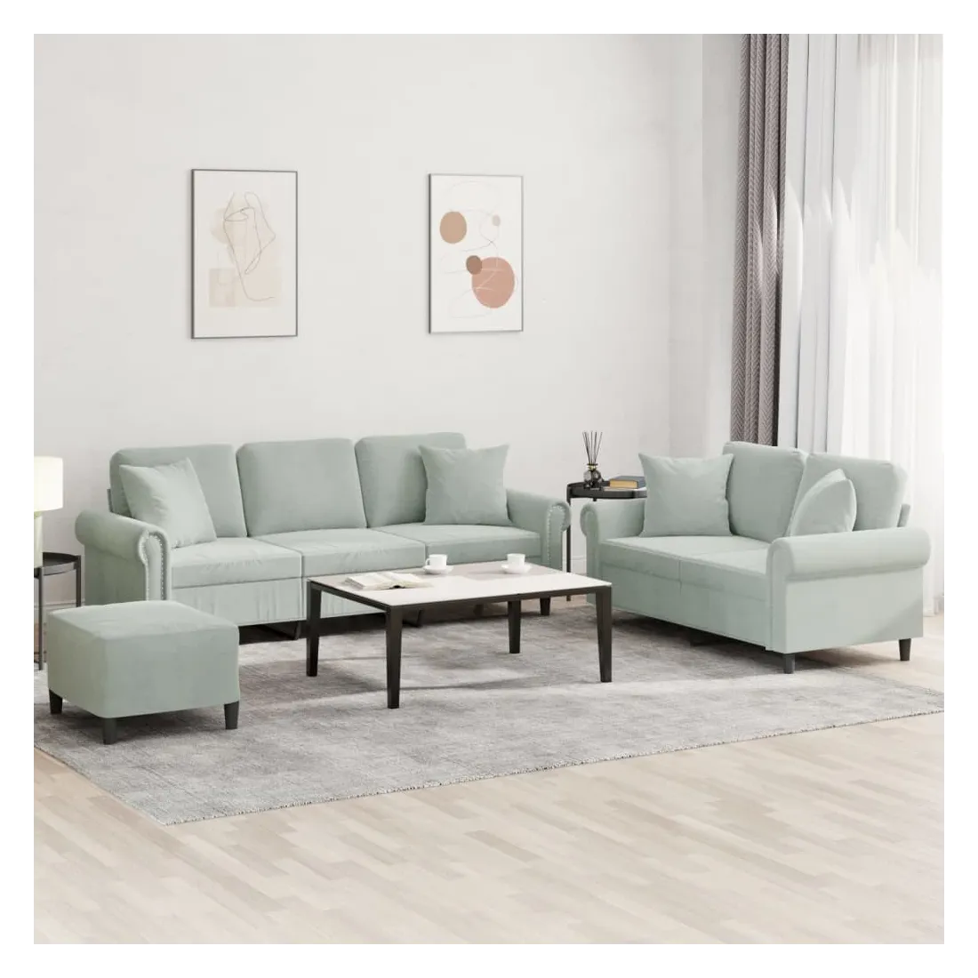 Cet ensemble de canapés est un excellent endroit pour discuter, lire, regarder la télévision ou simplement vous détendre. Il est destiné à être un point central de votre maison. Velours doux : le velours est un tissu doux et confortable, agréable au toucher.Structure robuste et stable : la structure en contreplaqué et en métal du canapé assure robustesse et stabilité.Expérience d'assise confortable : le canapé est très confortable avec le siège, les accoudoirs et les oreillers de dossier bien rembourrés.Oreillers de canapé pratiques : ces oreillers décoratifs carrés non seulement embellissent votre décor mais ils peuvent également apporter un confort supplémentaire lorsque vous êtes assis ou allongé.Pouf polyvalent : ce repose-pied convient pour reposer vos pieds lorsque vous êtes allongé dans un canapé, ou pour vous offrir un siège supplémentaire dans votre pièce. De plus, le design simple et la taille compacte le rendent idéal pour presque tous vos espaces de vie.