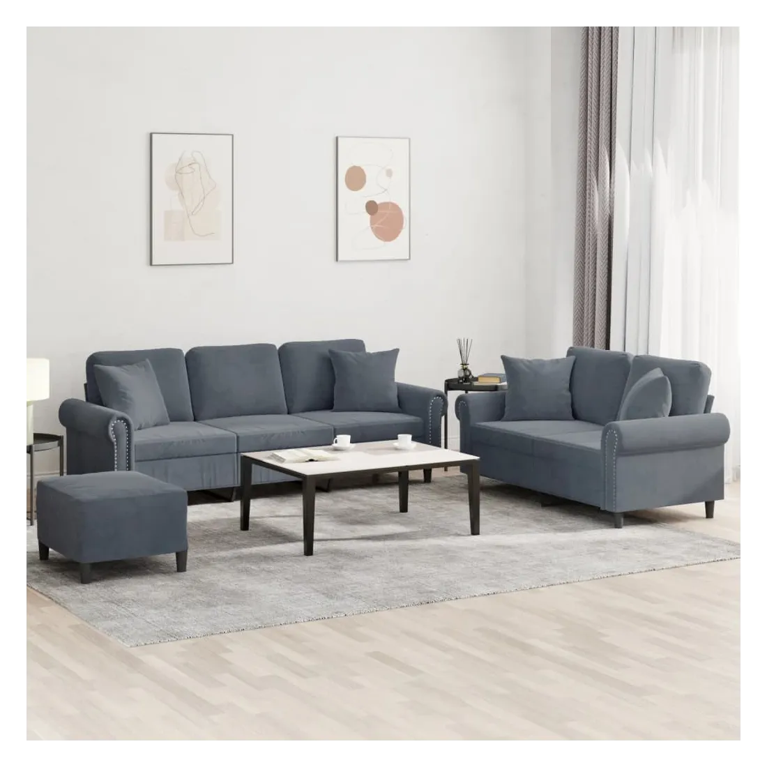 Cet ensemble de canapés est un excellent endroit pour discuter, lire, regarder la télévision ou simplement vous détendre. Il est destiné à être un point central de votre maison. Velours doux : le velours est un tissu doux et confortable, agréable au toucher.Structure robuste et stable : la structure en contreplaqué et en métal du canapé assure robustesse et stabilité.Expérience d'assise confortable : le canapé est très confortable avec le siège, les accoudoirs et les oreillers de dossier bien rembourrés.Oreillers de canapé pratiques : ces oreillers décoratifs carrés non seulement embellissent votre décor mais ils peuvent également apporter un confort supplémentaire lorsque vous êtes assis ou allongé.Pouf polyvalent : ce repose-pied convient pour reposer vos pieds lorsque vous êtes allongé dans un canapé, ou pour vous offrir un siège supplémentaire dans votre pièce. De plus, le design simple et la taille compacte le rendent idéal pour presque tous vos espaces de vie.