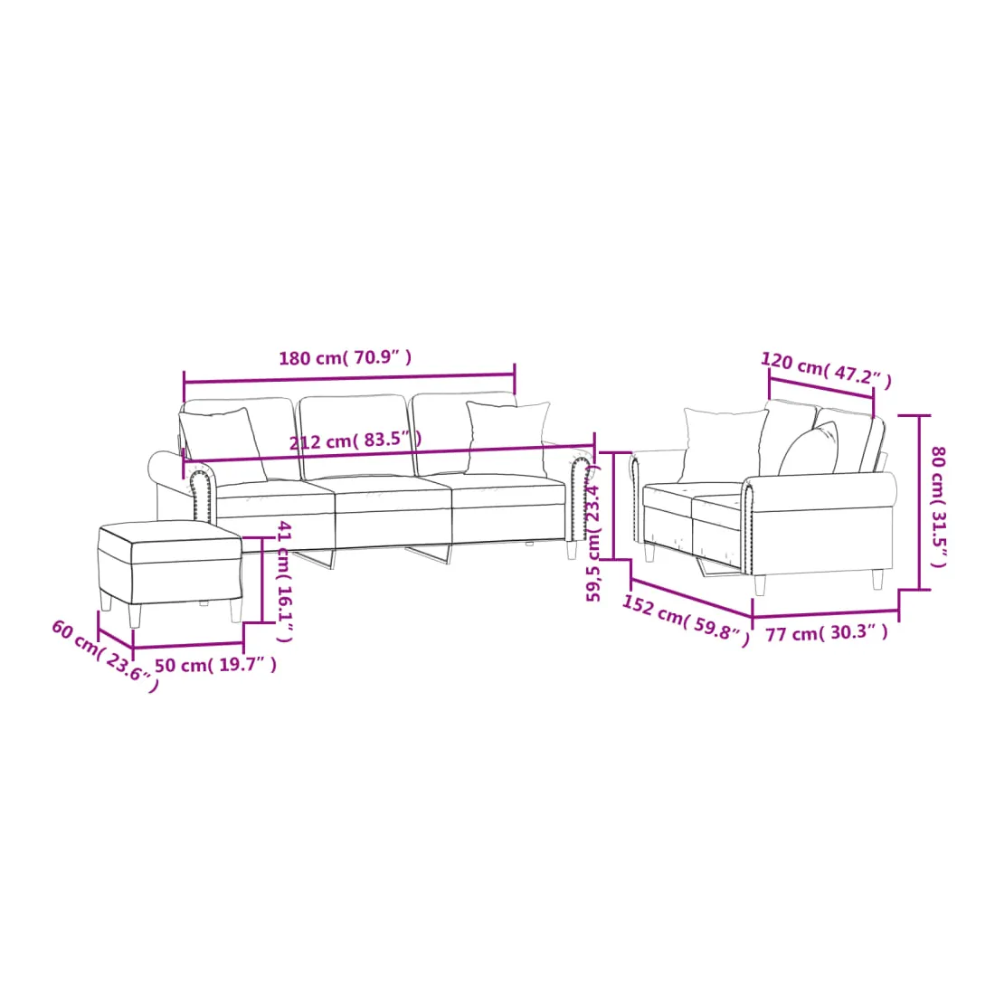 - Dimensions totales : 212 x 77 x 80 cm (l x P x H)