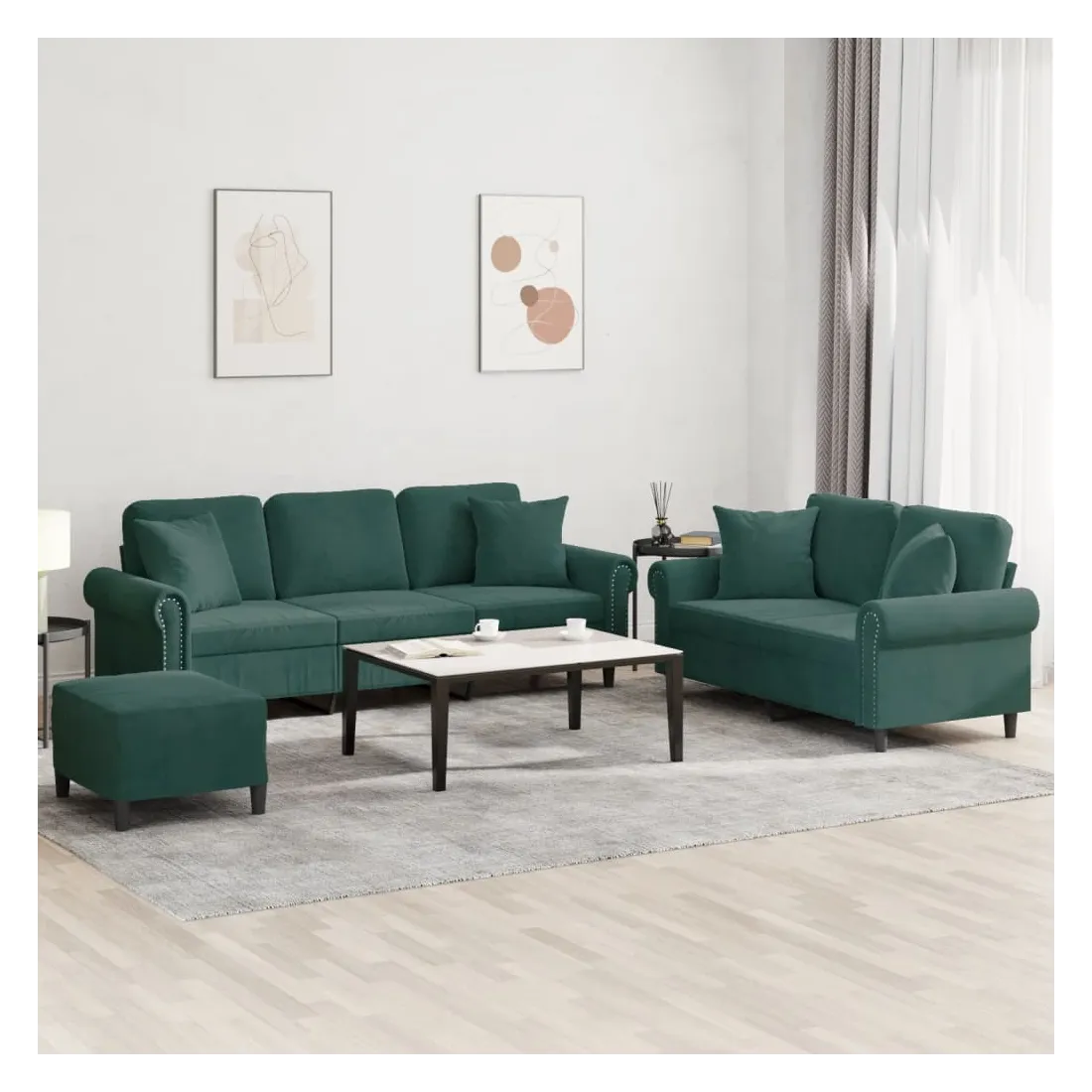 Cet ensemble de canapés est un excellent endroit pour discuter, lire, regarder la télévision ou simplement vous détendre. Il est destiné à être un point central de votre maison. Velours doux : le velours est un tissu doux et confortable, agréable au toucher.Structure robuste et stable : la structure en contreplaqué et en métal du canapé assure robustesse et stabilité.Expérience d'assise confortable : le canapé est très confortable avec le siège, les accoudoirs et les oreillers de dossier bien rembourrés.Oreillers de canapé pratiques : ces oreillers décoratifs carrés non seulement embellissent votre décor mais ils peuvent également apporter un confort supplémentaire lorsque vous êtes assis ou allongé.Pouf polyvalent : ce repose-pied convient pour reposer vos pieds lorsque vous êtes allongé dans un canapé, ou pour vous offrir un siège supplémentaire dans votre pièce. De plus, le design simple et la taille compacte le rendent idéal pour presque tous vos espaces de vie.