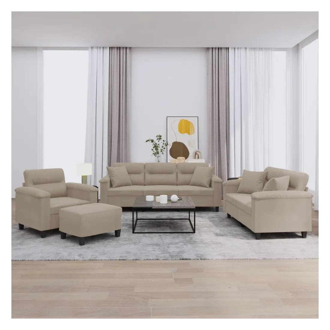 Cet ensemble de canapés est un excellent endroit pour discuter, lire, regarder la télévision ou simplement vous détendre. Il est destiné à être un point central de votre maison. Microfibre résistant : le microfibre est un tissu synthétique composé de fibres ultra-fines, particulièrement résistantes aux taches. Le tissu en microfibre est un excellent choix pour le rembourrage des meubles en raison de sa durabilité et de son nettoyage facile.Structure robuste et stable : la structure en contreplaqué et en métal du canapé assure robustesse et stabilité.Expérience d'assise confortable : le canapé est très confortable avec le siège, les accoudoirs et les oreillers de dossier bien rembourrés.Oreillers de canapé pratiques : ces oreillers décoratifs carrés non seulement embellissent votre décor mais ils peuvent également apporter un confort supplémentaire lorsque vous êtes assis ou allongé.Pouf polyvalent : ce repose-pied convient pour reposer vos pieds lorsque vous êtes allongé dans un canapé, ou pour vous offrir un siège supplémentaire dans votre pièce. De plus, le design simple et la taille compacte le rendent idéal pour presque tous vos espaces de vie.