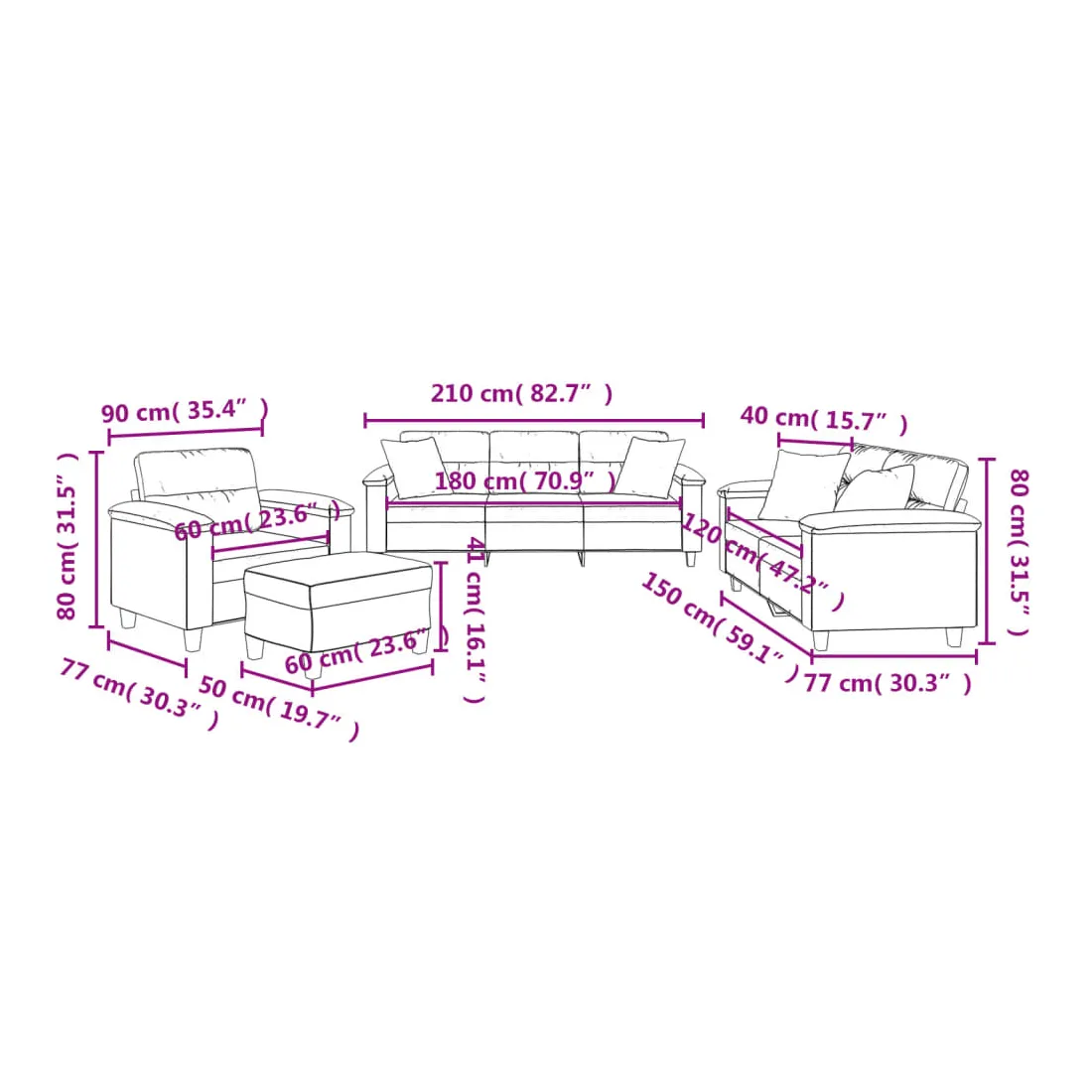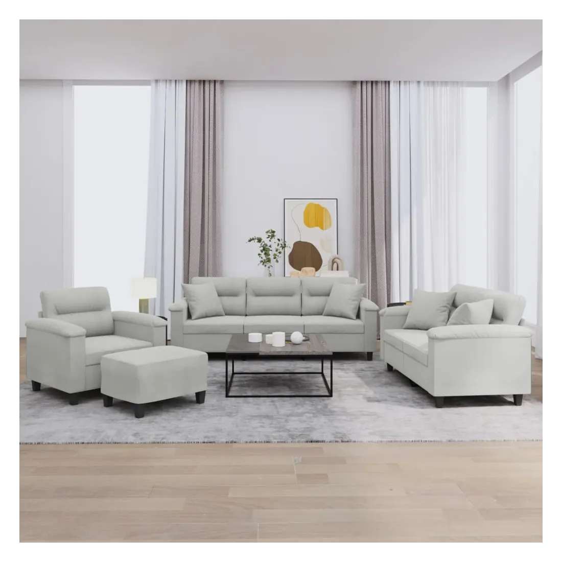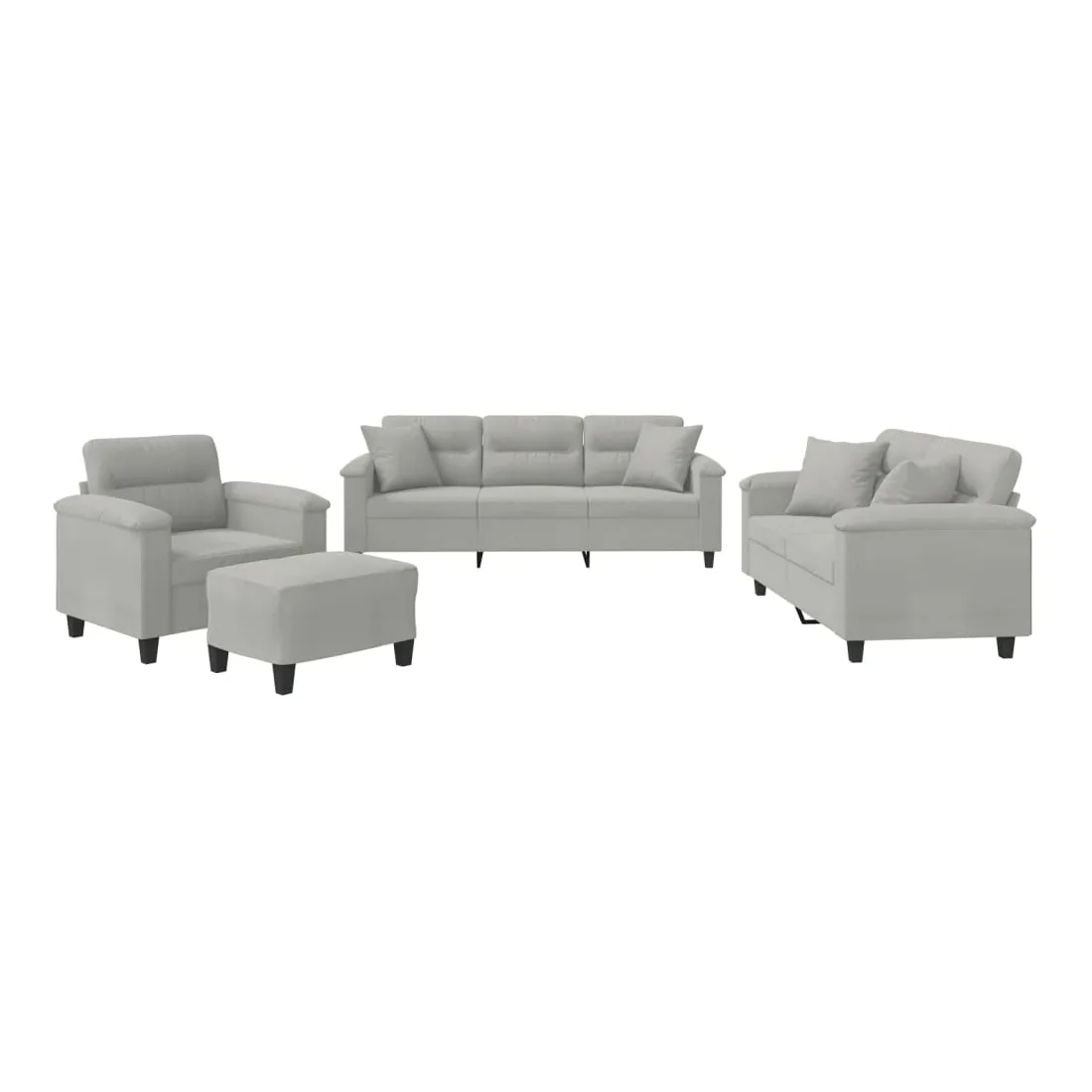 Cet ensemble de canapés est un excellent endroit pour discuter, lire, regarder la télévision ou simplement vous détendre. Il est destiné à être un point central de votre maison. Microfibre résistant : le microfibre est un tissu synthétique composé de fibres ultra-fines, particulièrement résistantes aux taches. Le tissu en microfibre est un excellent choix pour le rembourrage des meubles en raison de sa durabilité et de son nettoyage facile.Structure robuste et stable : la structure en contreplaqué et en métal du canapé assure robustesse et stabilité.Expérience d'assise confortable : le canapé est très confortable avec le siège, les accoudoirs et les oreillers de dossier bien rembourrés.Oreillers de canapé pratiques : ces oreillers décoratifs carrés non seulement embellissent votre décor mais ils peuvent également apporter un confort supplémentaire lorsque vous êtes assis ou allongé.Pouf polyvalent : ce repose-pied convient pour reposer vos pieds lorsque vous êtes allongé dans un canapé, ou pour vous offrir un siège supplémentaire dans votre pièce. De plus, le design simple et la taille compacte le rendent idéal pour presque tous vos espaces de vie.