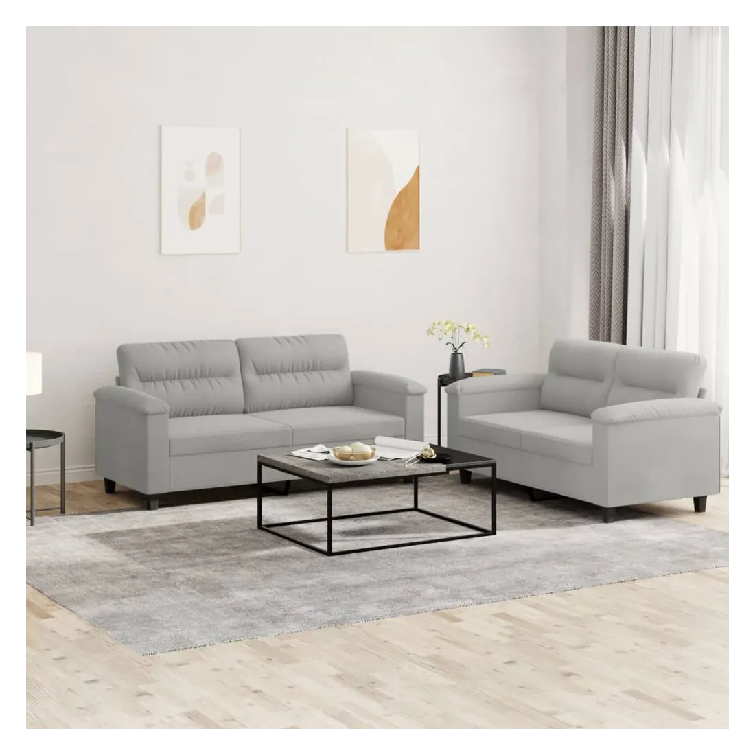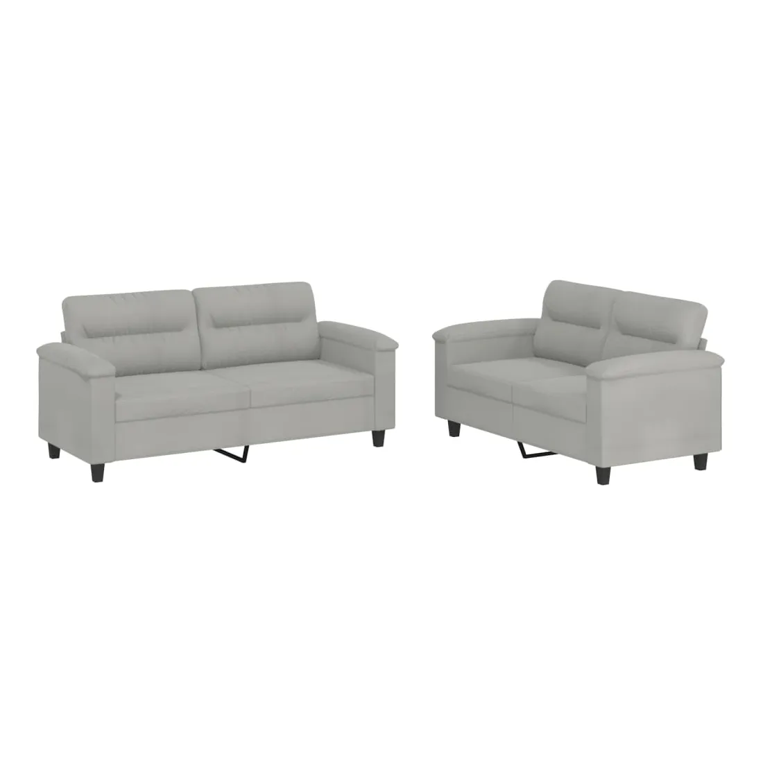 Cet ensemble de canapés est un excellent endroit pour discuter, lire, regarder la télévision ou simplement vous détendre. Il est destiné à être un point central de votre maison. Microfibre résistant : le microfibre est un tissu synthétique composé de fibres ultra-fines, particulièrement résistantes aux taches. Le tissu en microfibre est un excellent choix pour le rembourrage des meubles en raison de sa durabilité et de son nettoyage facile.Structure robuste et stable : la structure en contreplaqué et en métal du canapé assure robustesse et stabilité.Expérience d'assise confortable : le canapé est très confortable avec le siège, les accoudoirs et les oreillers de dossier bien rembourrés.