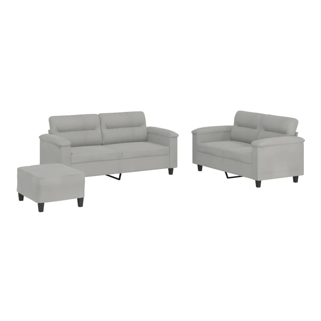 Cet ensemble de canapés est un excellent endroit pour discuter, lire, regarder la télévision ou simplement vous détendre. Il est destiné à être un point central de votre maison. Microfibre résistant : le microfibre est un tissu synthétique composé de fibres ultra-fines, particulièrement résistantes aux taches. Le tissu en microfibre est un excellent choix pour le rembourrage des meubles en raison de sa durabilité et de son nettoyage facile.Structure robuste et stable : la structure en contreplaqué et en métal du canapé assure robustesse et stabilité.Expérience d'assise confortable : le canapé est très confortable avec le siège, les accoudoirs et les oreillers de dossier bien rembourrés.Pouf polyvalent : ce repose-pied convient pour reposer vos pieds lorsque vous êtes allongé dans un canapé, ou pour vous offrir un siège supplémentaire dans votre pièce. De plus, le design simple et la taille compacte le rendent idéal pour presque tous vos espaces de vie.