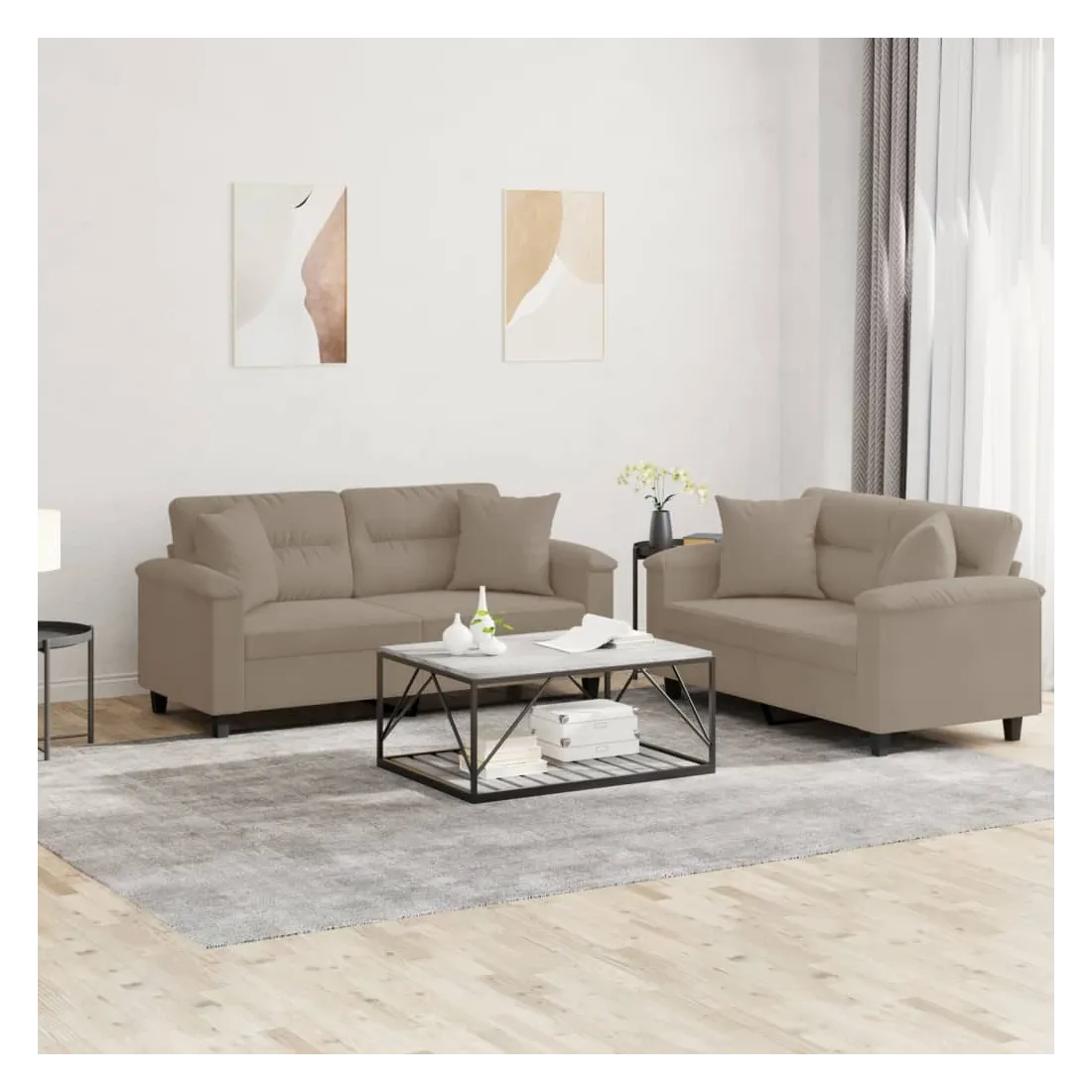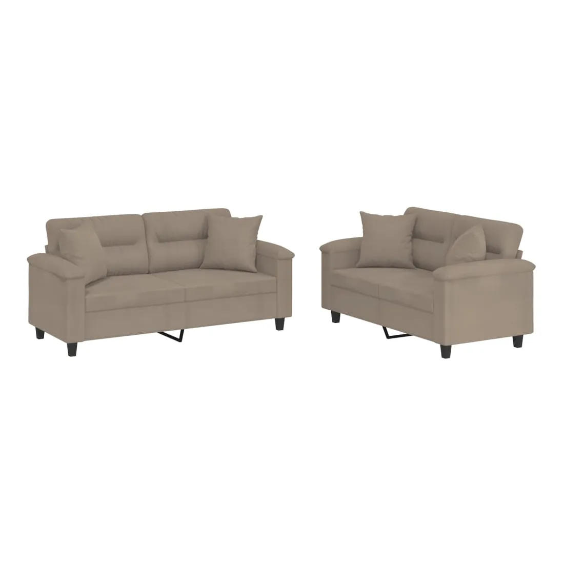 Cet ensemble de canapés est un excellent endroit pour discuter, lire, regarder la télévision ou simplement vous détendre. Il est destiné à être un point central de votre maison. Microfibre résistant : le microfibre est un tissu synthétique composé de fibres ultra-fines, particulièrement résistantes aux taches. Le tissu en microfibre est un excellent choix pour le rembourrage des meubles en raison de sa durabilité et de son nettoyage facile.Structure robuste et stable : la structure en contreplaqué et en métal du canapé assure robustesse et stabilité.Expérience d'assise confortable : le canapé est très confortable avec le siège, les accoudoirs et les oreillers de dossier bien rembourrés.Oreillers de canapé pratiques : ces oreillers décoratifs carrés non seulement embellissent votre décor mais ils peuvent également apporter un confort supplémentaire lorsque vous êtes assis ou allongé.