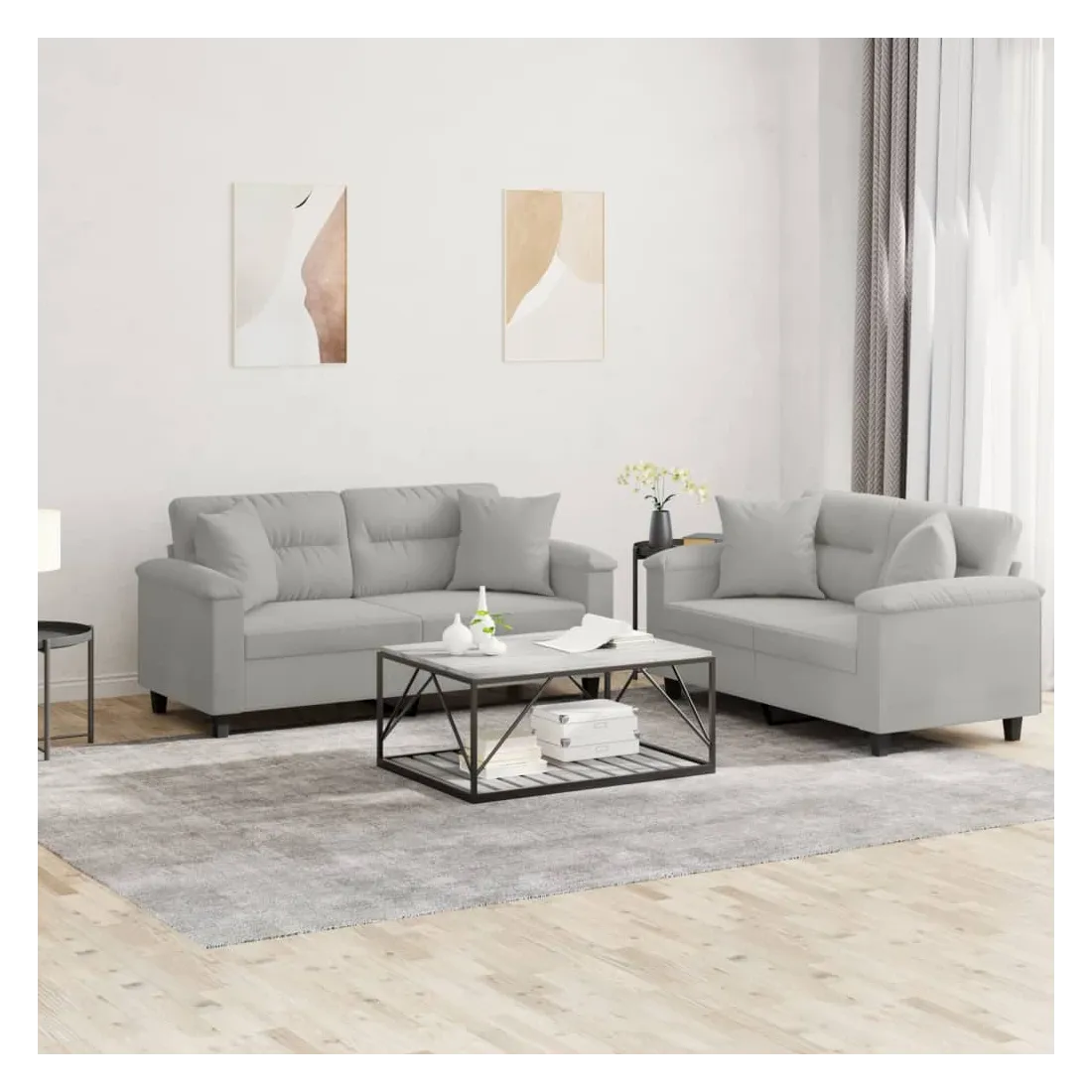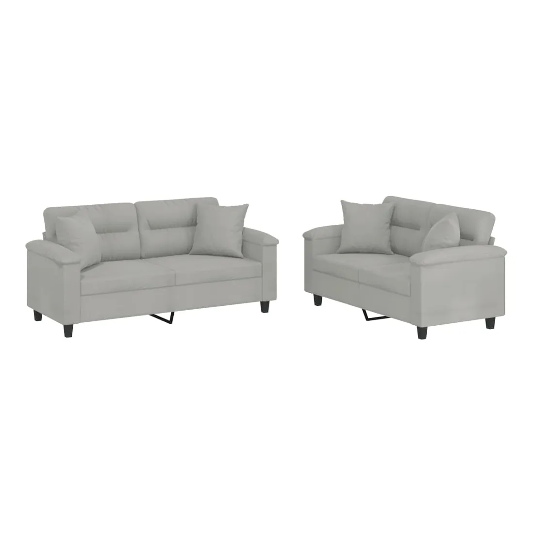 Cet ensemble de canapés est un excellent endroit pour discuter, lire, regarder la télévision ou simplement vous détendre. Il est destiné à être un point central de votre maison. Microfibre résistant : le microfibre est un tissu synthétique composé de fibres ultra-fines, particulièrement résistantes aux taches. Le tissu en microfibre est un excellent choix pour le rembourrage des meubles en raison de sa durabilité et de son nettoyage facile.Structure robuste et stable : la structure en contreplaqué et en métal du canapé assure robustesse et stabilité.Expérience d'assise confortable : le canapé est très confortable avec le siège, les accoudoirs et les oreillers de dossier bien rembourrés.Oreillers de canapé pratiques : ces oreillers décoratifs carrés non seulement embellissent votre décor mais ils peuvent également apporter un confort supplémentaire lorsque vous êtes assis ou allongé.