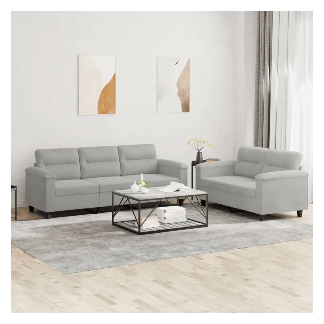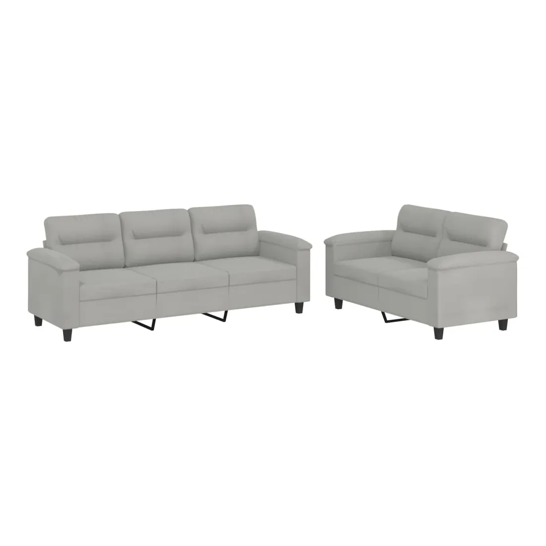 Cet ensemble de canapés est un excellent endroit pour discuter, lire, regarder la télévision ou simplement vous détendre. Il est destiné à être un point central de votre maison. Microfibre résistant : le microfibre est un tissu synthétique composé de fibres ultra-fines, particulièrement résistantes aux taches. Le tissu en microfibre est un excellent choix pour le rembourrage des meubles en raison de sa durabilité et de son nettoyage facile.Structure robuste et stable : la structure en contreplaqué et en métal du canapé assure robustesse et stabilité.Expérience d'assise confortable : le canapé est très confortable avec le siège, les accoudoirs et les oreillers de dossier bien rembourrés.