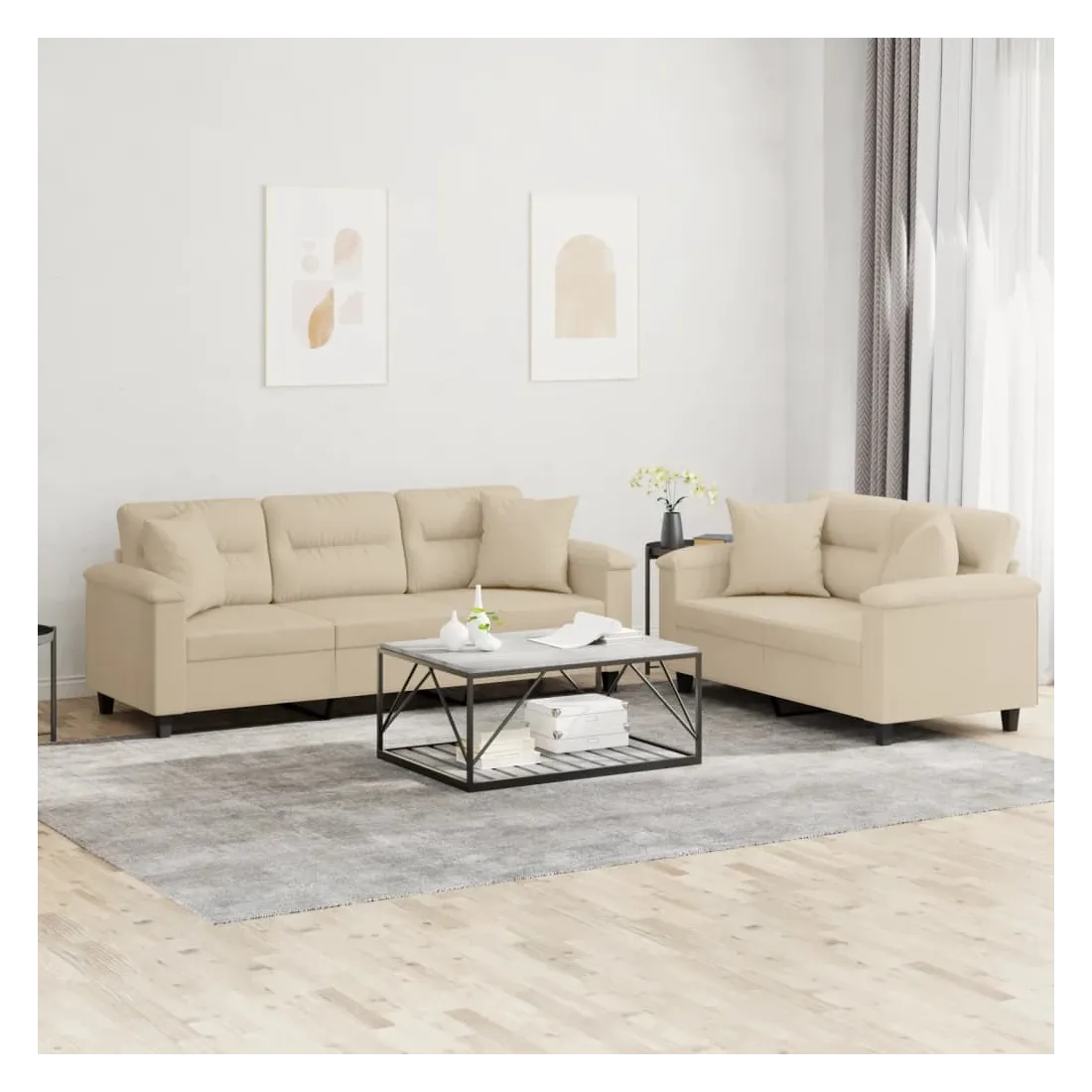 Cet ensemble de canapés est un excellent endroit pour discuter, lire, regarder la télévision ou simplement vous détendre. Il est destiné à être un point central de votre maison. Microfibre résistant : le microfibre est un tissu synthétique composé de fibres ultra-fines, particulièrement résistantes aux taches. Le tissu en microfibre est un excellent choix pour le rembourrage des meubles en raison de sa durabilité et de son nettoyage facile.Structure robuste et stable : la structure en contreplaqué et en métal du canapé assure robustesse et stabilité.Expérience d'assise confortable : le canapé est très confortable avec le siège, les accoudoirs et les oreillers de dossier bien rembourrés.Oreillers de canapé pratiques : ces oreillers décoratifs carrés non seulement embellissent votre décor mais ils peuvent également apporter un confort supplémentaire lorsque vous êtes assis ou allongé.