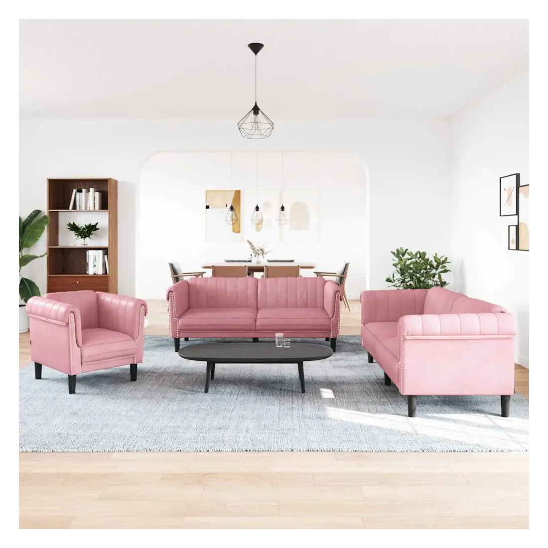 Cet ensemble de canapés est un excellent endroit pour discuter, lire, regarder la télévision ou simplement vous détendre. Il est destiné à être un point central de votre maison. Velours doux : le velours est un tissu doux et confortable, agréable au toucher. Expérience de siège confortable : la chaise de canapé est très confortable grâce à l'assise, aux accoudoirs et au dossier très rembourrés. Pieds de soutien : le canapé rembourré est soutenu par des pieds robustes, qui assurent sa stabilité, sa sécurité et sa fermeté. Design accrocheur : doté d'un design simple mais moderne, ce siège de salon est destiné à attirer l'attention dans votre pièce.