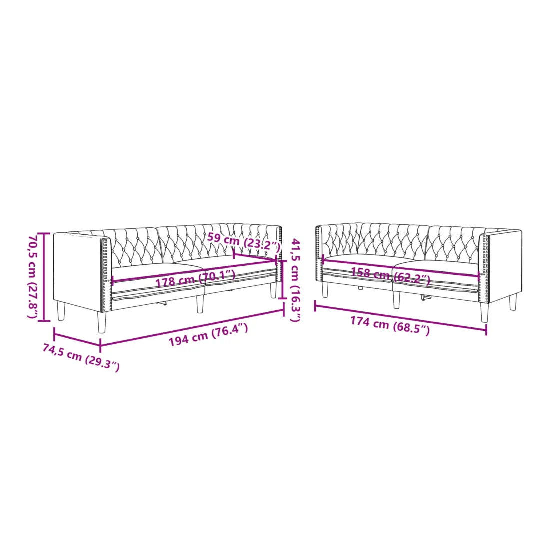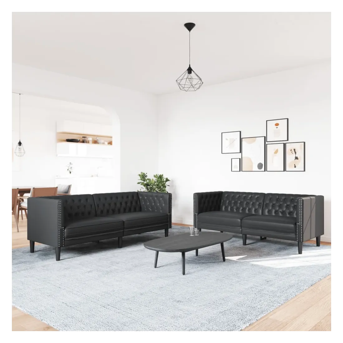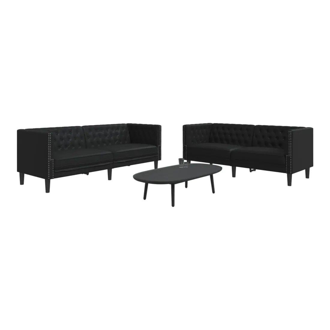 Cet ensemble de canapé Chesterfield est un excellent endroit pour discuter, lire, regarder la télévision ou simplement se détendre. Il est destiné à être un point central dans votre maison. Longue durée de vie et entretien facile : le similicuir est un matériau très durable qui résiste aux taches, ce qui le rend facile à nettoyer avec un chiffon humide. Sa surface lisse lui confère un aspect élégant qui ressemble à celui du cuir véritable.Expérience d'assise confortable : le canapé est très confortable avec les sièges, les accoudoirs et les oreillers de dossier bien rembourrés.Style Chesterfield : avec le dossier et les accoudoirs classiques à boutons tuftés, et une hauteur de dossier et d'accoudoir uniforme, le canapé rehaussera n'importe quelle pièce, offrant à la fois style et confort.Pieds de soutien : le canapé rembourré est soutenu par des pieds robustes, qui assurent sa stabilité, sa sécurité et sa fermeté.