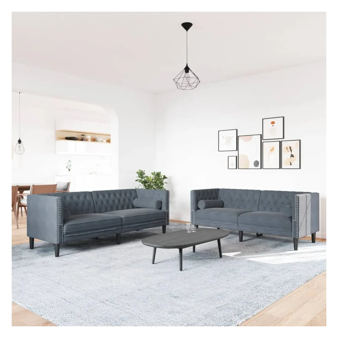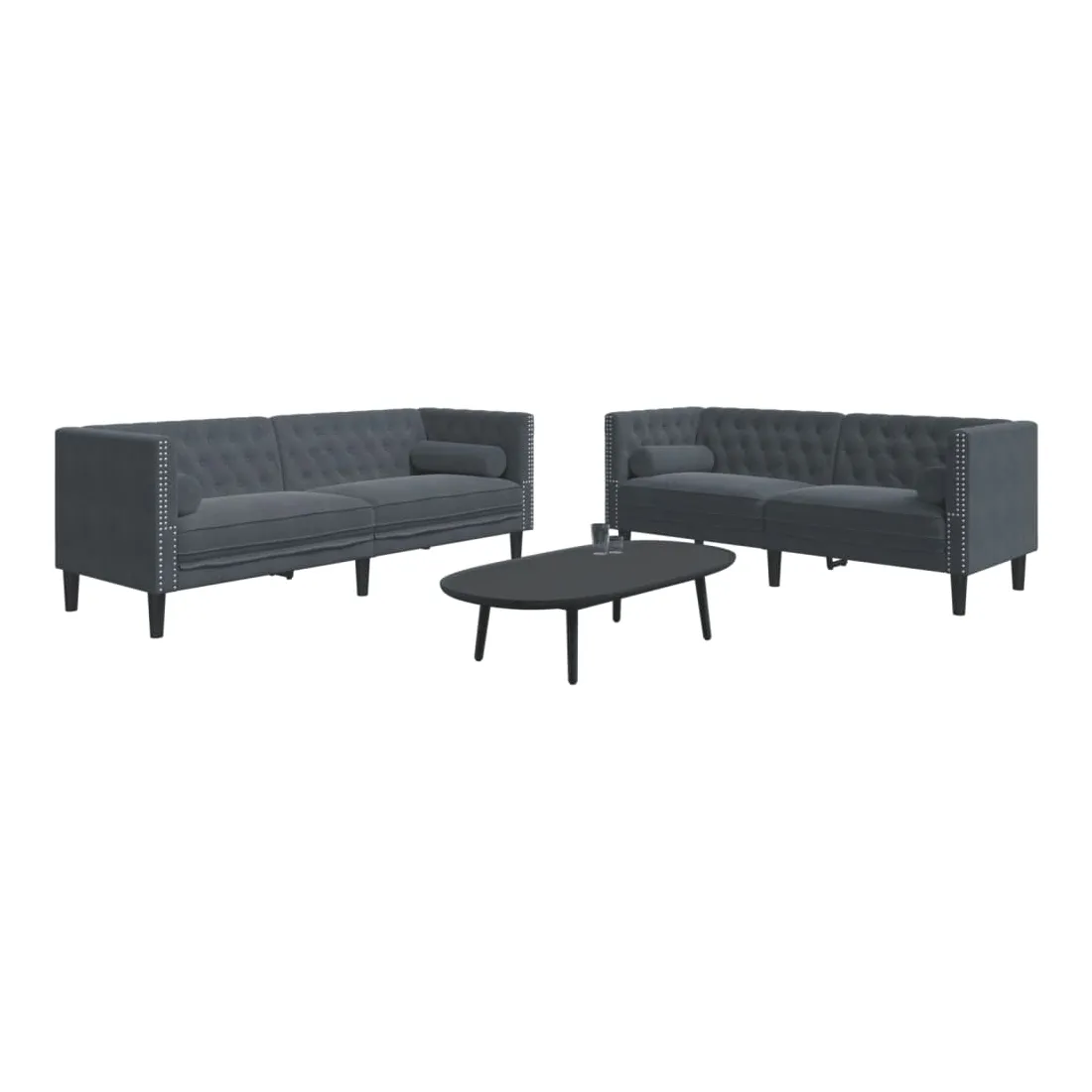 Cet ensemble de canapé Chesterfield est un excellent endroit pour discuter, lire, regarder la télévision ou simplement se détendre. Il est destiné à être un point central dans votre maison. Matériau doux et confortable : le tissu en velours présente une surface douce et lisse qui offre une sensation agréable contre la peau, vous apportant chaleur et confort ultime.Expérience d'assise confortable : le canapé est très confortable avec les sièges, les accoudoirs et les oreillers de dossier bien rembourrés. Les traversins inclus ne font pas qu'embellir votre décor, ils peuvent aussi ajouter un confort supplémentaire lorsque vous êtes assis ou allongé.Style Chesterfield : avec le dossier et les accoudoirs classiques à boutons tuftés, et une hauteur de dossier et d'accoudoir uniforme, le canapé rehaussera n'importe quelle pièce, offrant à la fois style et confort.Pieds de soutien : le canapé rembourré est soutenu par des pieds robustes, qui assurent sa stabilité, sa sécurité et sa fermeté.