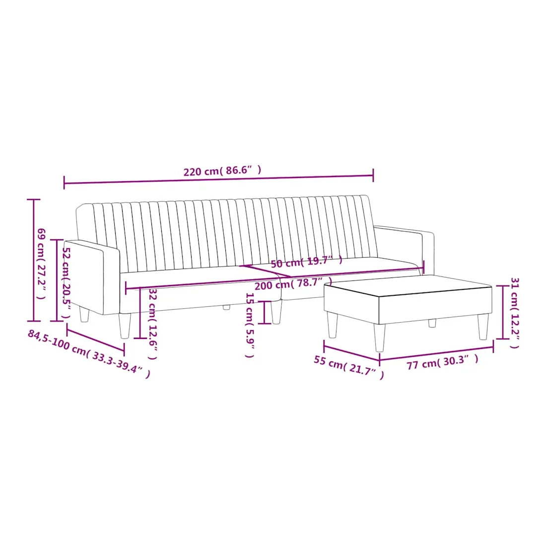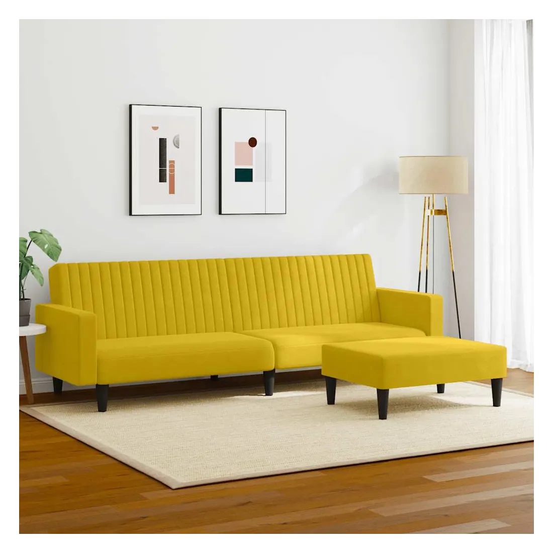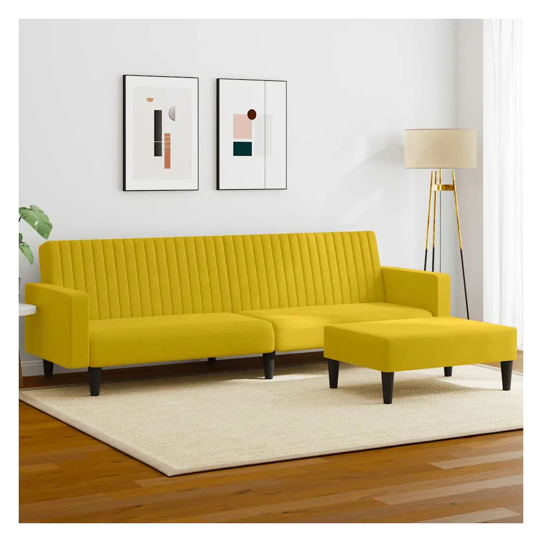 Cet ensemble de canapés est un excellent endroit pour discuter, lire, regarder la télévision ou simplement vous détendre. Il est destiné à être un point central de votre maison. Velours doux : le velours est un tissu doux et confortable, agréable au toucher. Fonction 2 en 1 : le canapé-lit se transforme rapidement et facilement d'un canapé en un lit et à nouveau en canapé. Vous pouvez pousser les deux dossiers séparés partiellement ou complètement vers le bas pour créer un endroit idéal pour une sieste ou un lit double. Pouf polyvalent : ce repose-pied convient pour reposer vos pieds lorsque vous êtes allongé dans un canapé, ou pour vous offrir un siège supplémentaire dans votre pièce. De plus, le design simple et la taille compacte le rendent idéal pour presque tous vos espaces de vie. Expérience de siège confortable : la chaise de canapé est très confortable grâce à l'assise et au dossier très rembourrés. Pieds de soutien : le canapé rembourré est soutenu par des pieds robustes, qui assurent sa stabilité, sa sécurité et sa fermeté.