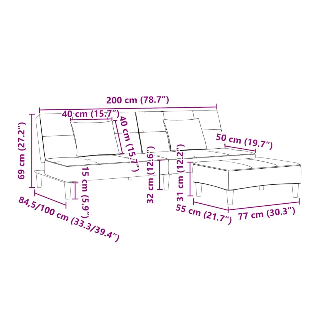 - Dimensions totales : 200 x 84,5 x 69 cm (L x l x H)