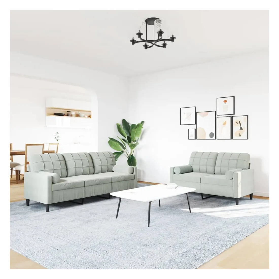 Cet ensemble de canapés est un excellent endroit pour discuter, lire, regarder la télévision ou simplement vous détendre. Il est destiné à être un point central de votre maison. Matériau doux et confortable : le tissu en velours présente une surface douce et lisse qui offre une sensation agréable contre la peau, vous apportant chaleur et confort ultime.Cadre robuste et stable : le cadre en métal du canapé de salon assure robustesse et stabilité.Expérience d'assise confortable : le canapé est très confortable avec les sièges, les accoudoirs et les oreillers de dossier bien rembourrés.Design accrocheur : doté d'un design simple mais moderne, ce canapé est destiné à attirer l'attention dans votre chambre.