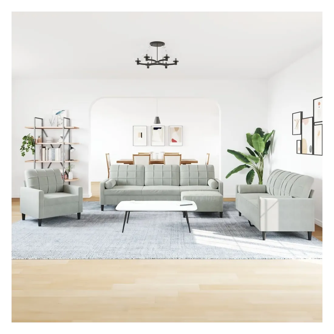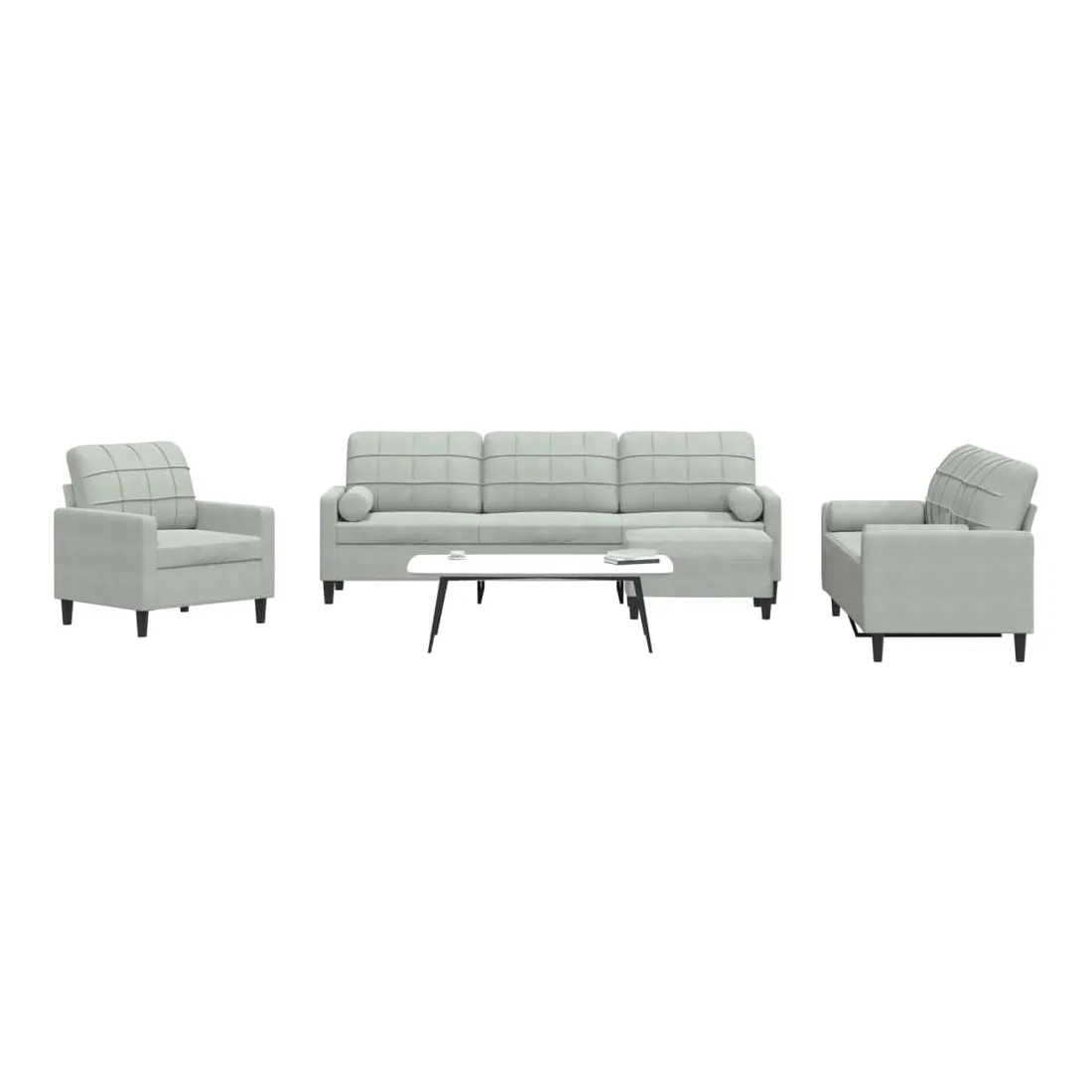 Cet ensemble de canapés est un excellent endroit pour discuter, lire, regarder la télévision ou simplement vous détendre. Il est destiné à être un point central de votre maison. Matériau doux et confortable : le tissu en velours présente une surface douce et lisse qui offre une sensation agréable contre la peau, vous apportant chaleur et confort ultime. Cadre robuste et stable : le cadre en métal du canapé de salon assure robustesse et stabilité. Expérience d'assise confortable : le canapé est très confortable avec les sièges, les accoudoirs et les oreillers de dossier bien rembourrés. Les traversins inclus ne font pas qu'embellir votre décor, ils peuvent aussi ajouter un confort supplémentaire lorsque vous êtes assis ou allongé. Pouf polyvalent : ce repose-pied convient pour reposer vos pieds lorsque vous êtes allongé dans un canapé, ou pour vous offrir un siège supplémentaire dans votre pièce. De plus, le design simple et la taille compacte le rendent idéal pour presque tous vos espaces de vie.Design accrocheur : doté d'un design simple mais moderne, ce canapé est destiné à attirer l'attention dans votre chambre.