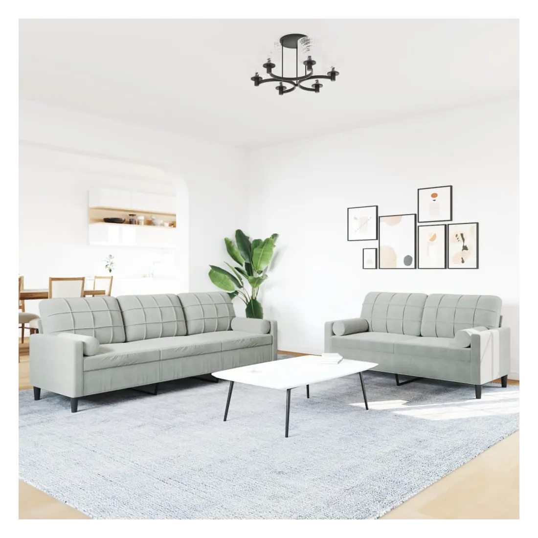 Cet ensemble de canapés est un excellent endroit pour discuter, lire, regarder la télévision ou simplement vous détendre. Il est destiné à être un point central de votre maison. Matériau doux et confortable : le tissu en velours présente une surface douce et lisse qui offre une sensation agréable contre la peau, vous apportant chaleur et confort ultime. Cadre robuste et stable : le cadre en métal du canapé de salon assure robustesse et stabilité. Expérience d'assise confortable : le canapé est très confortable avec les sièges, les accoudoirs et les oreillers de dossier bien rembourrés. Les traversins inclus ne font pas qu'embellir votre décor, ils peuvent aussi ajouter un confort supplémentaire lorsque vous êtes assis ou allongé. Design accrocheur : doté d'un design simple mais moderne, ce canapé est destiné à attirer l'attention dans votre chambre.