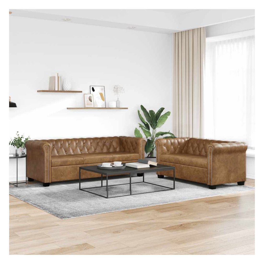 Cet ensemble de canapés de Chesterfield, composé de 2 et 3 places, est la combinaison parfaite de confort et d'élégance et sera un excellent ajout à tout décor de maison ou de bureau. Cet ensemble de canapés à 2 et 3 places, avec ses détails à touffes et à clous et ses accoudoirs courbés, va ajouter une touche de luxe, de classe et de style à tout décor intérieur. Son siège rembourré épais est extra confortable, la structure élégant est durable et stable. Le cuir artificiel de haute qualité est facile à nettoyer et résistant. La livraison comprend un canapé à 2 places et un canapé à 3 places. L’assemblage est très facile.