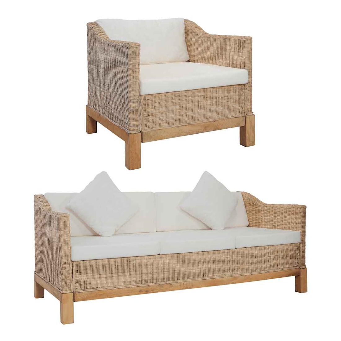 Cet ensemble de canapés en rotin associe style et fonctionnalité et sera un excellent ajout à votre maison. Grâce au matériau en rotin véritable, l'ensemble est facile à nettoyer, résistant à l'usure et adapté à une utilisation quotidienne. Il dispose d'un cadre en bois robuste, très durable et stable. Les coussins épais de dossier et de siège sont considérablement confortables et également lavables grâce à leurs housses amovibles. La livraison inclut un fauteuil, un canapé à 3 places, 4 coussins de siège, 3 coussins de dossier et 2 oreillers. Maximum 110 kg par siège. Soyez conscient du risque de feu ouvert et d'autres sources de forte chaleur à proximité de l'appareil.