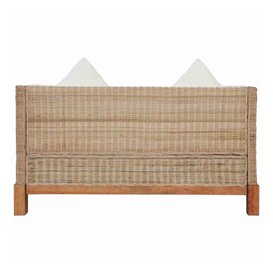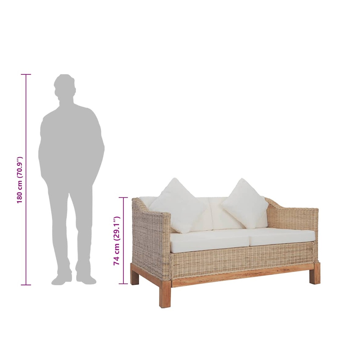 Ce canapé en rotin naturel associe style et fonctionnalité et sera un excellent supplément à votre maison. Grâce au matériau de rotin véritable, le canapé est facile à nettoyer, résistant à l'usure et adapté à une utilisation quotidienne. Il dispose d'un cadre en bois robuste, très durable et stable. Les coussins épais de dossier et de siège sont considérablement confortables et également lavables grâce à leurs housses amovibles. La livraison comprend un canapé à 2 places, 2 coussins de siège, 2 coussins de dossier et 2 oreillers. Maximum 110 kg par siège. Soyez conscient du risque de feux ouverts et d'autres sources de forte chaleur à proximité du produit.