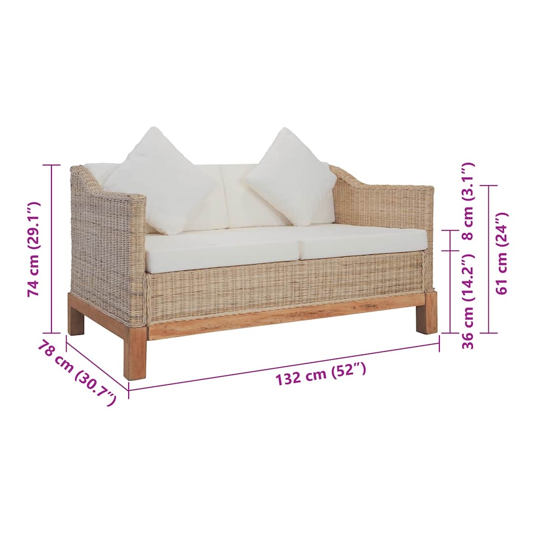 Ce canapé en rotin naturel associe style et fonctionnalité et sera un excellent supplément à votre maison. Grâce au matériau de rotin véritable, le canapé est facile à nettoyer, résistant à l'usure et adapté à une utilisation quotidienne. Il dispose d'un cadre en bois robuste, très durable et stable. Les coussins épais de dossier et de siège sont considérablement confortables et également lavables grâce à leurs housses amovibles. La livraison comprend un canapé à 2 places, 2 coussins de siège, 2 coussins de dossier et 2 oreillers.