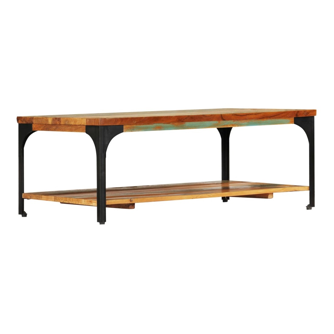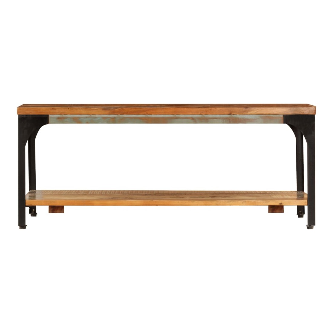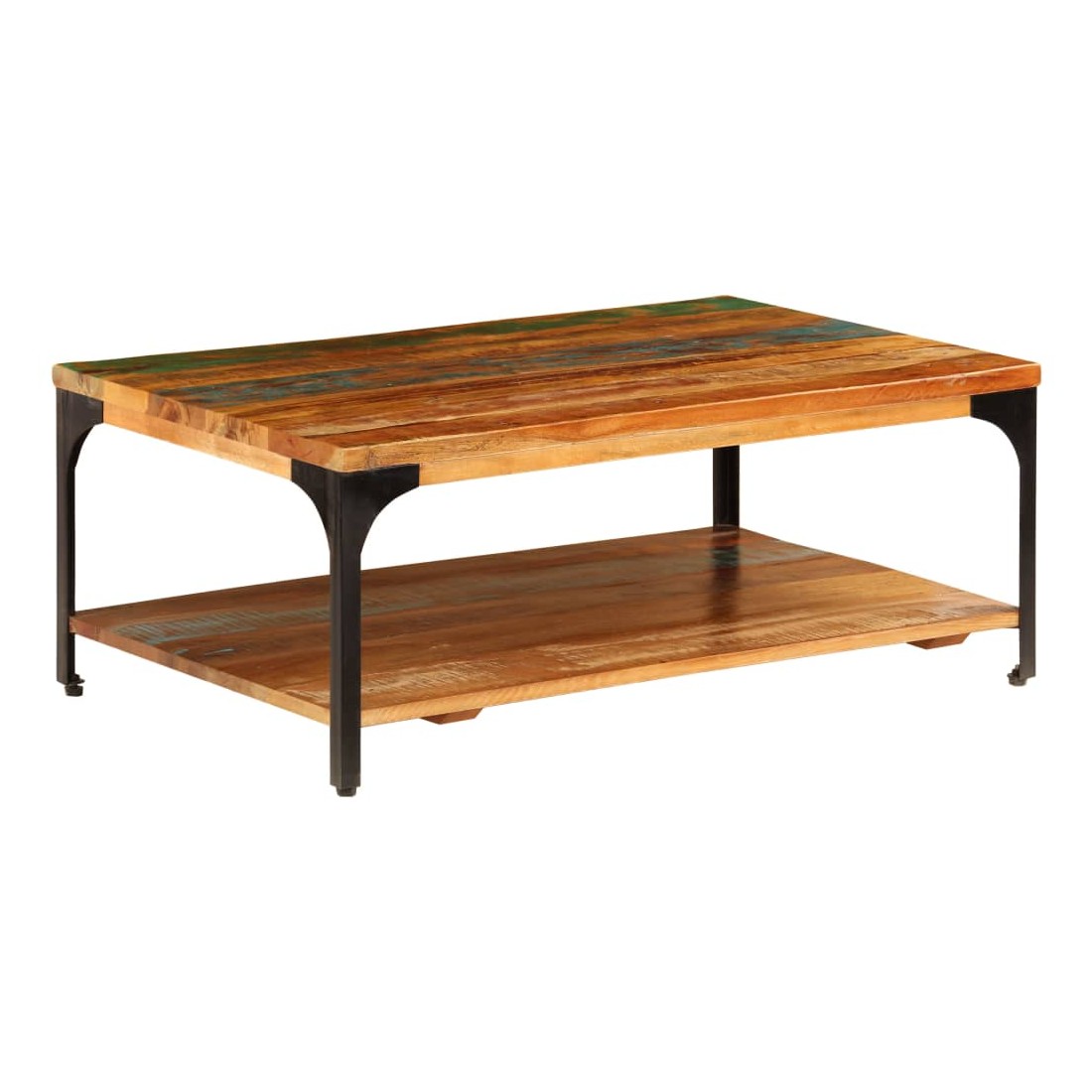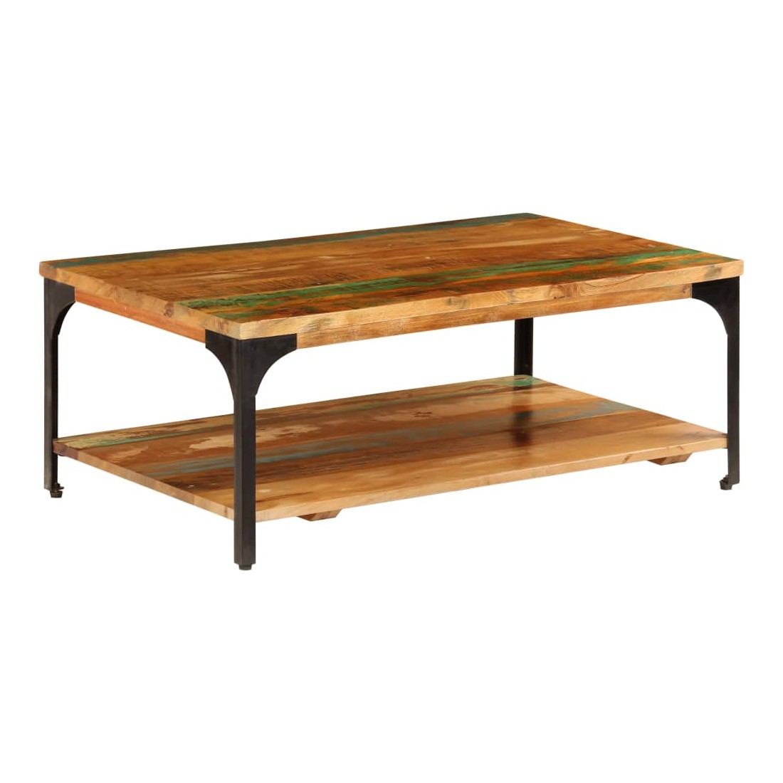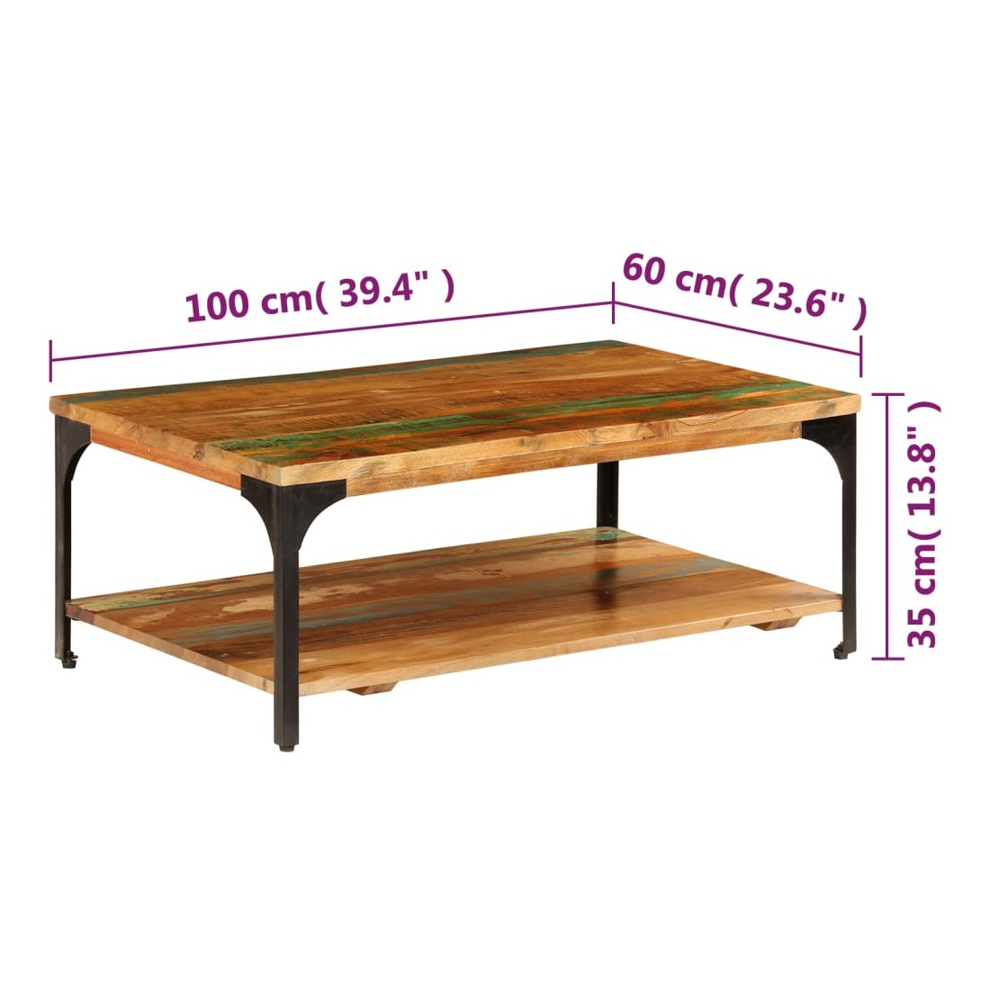Cette table basse en bois dégage un charme vintage et sera un excellent supplément à la décoration de votre intérieur. Cette table d'appoint est fabriquée en bois de récupération solide et en acier enduit de poudre, ce qui la rend considérablement robuste et durable. Le bois de récupération provient des solives, des planchers et des poutres de soutien d'anciens bâtiments démolis et peut comprendre différents types de bois comme le pin, le teck, le hêtre, le chêne, le cèdre, le bois de manguier, l'acacia, etc. Cela signifie que le bois de récupération conserve les caractéristiques de ces différents types de bois. Le bois de récupération est déjà vieilli, corrodé et séché, donc il ne rétrécit ni se plie. Chaque étape du processus de fabrication est réalisée avec le plus grand soin, que ce soit le polissage, la peinture ou le laquage. Le savoir-faire et les grains de bois esthétiquement attrayants rendent chaque pièce de notre bout de canapé légèrement différent l'un de l'autre. Grâce à l'étagère située sous la table, vous pouvez ranger vos livres, tasses et autres effets personnels. L'assemblage est facile. Remarque importante : les fibres et les couleurs du bois peuvent varier d'une pièce à l'autre, ce qui rend chacune de nos tables basses unique. La livraison est aléatoire, ce qui garantit l'exclusivité et l'individualité de votre produit.