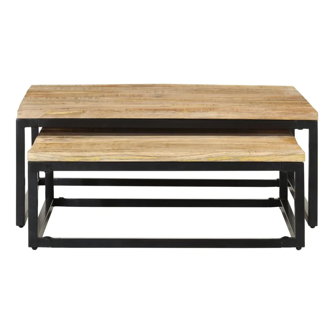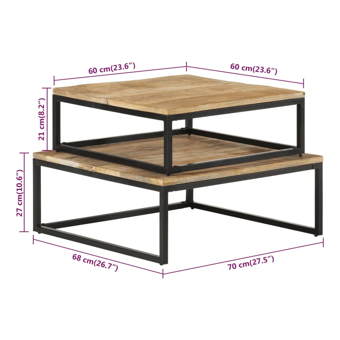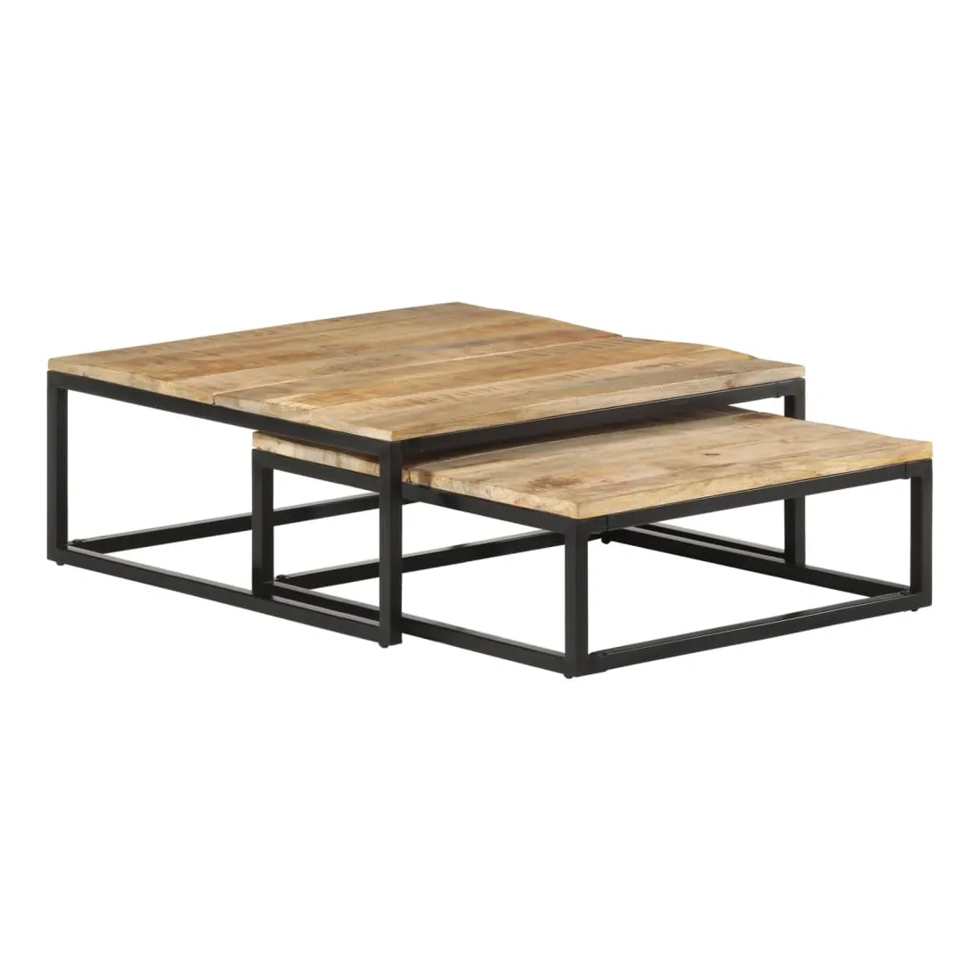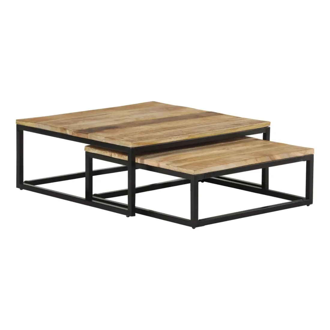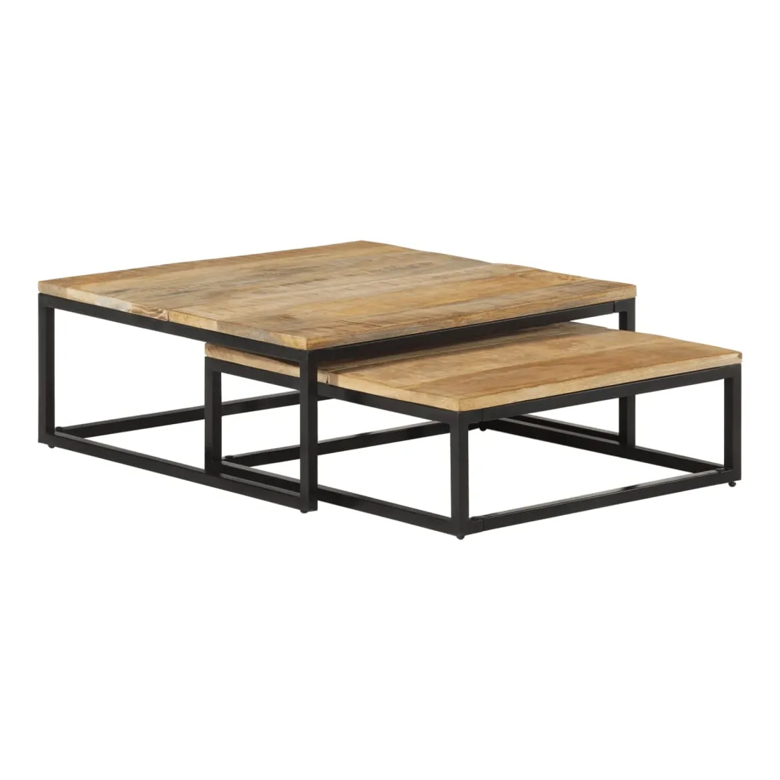 Ajoutez un aspect industriel à votre espace de vie avec ces tables basses gigognes en bois ! La table basse est fabriquée à la main en bois de manguier brut avec une finition naturelle, un bois dur tropical avec la force de soutenir le poids. Elle résiste également à l’usure du temps, ce qui la rend stable et durable. Le savoir-faire et les belles veines du bois rendent chaque meuble unique et légèrement différent l'un de l'autre. La base en fer enduit de poudre noir offre une stabilité et une robustesse supplémentaires aux tables. En outre, la petite table peut être emboîtée sous la plus grande pour économiser de l’espace. Remarque importante : les couleurs et les grains peuvent varier d'une pièce à l'autre, rendant chaque pièce unique. La livraison est aléatoire, ce qui garantit l'exclusivité et l'individualité de votre produit.