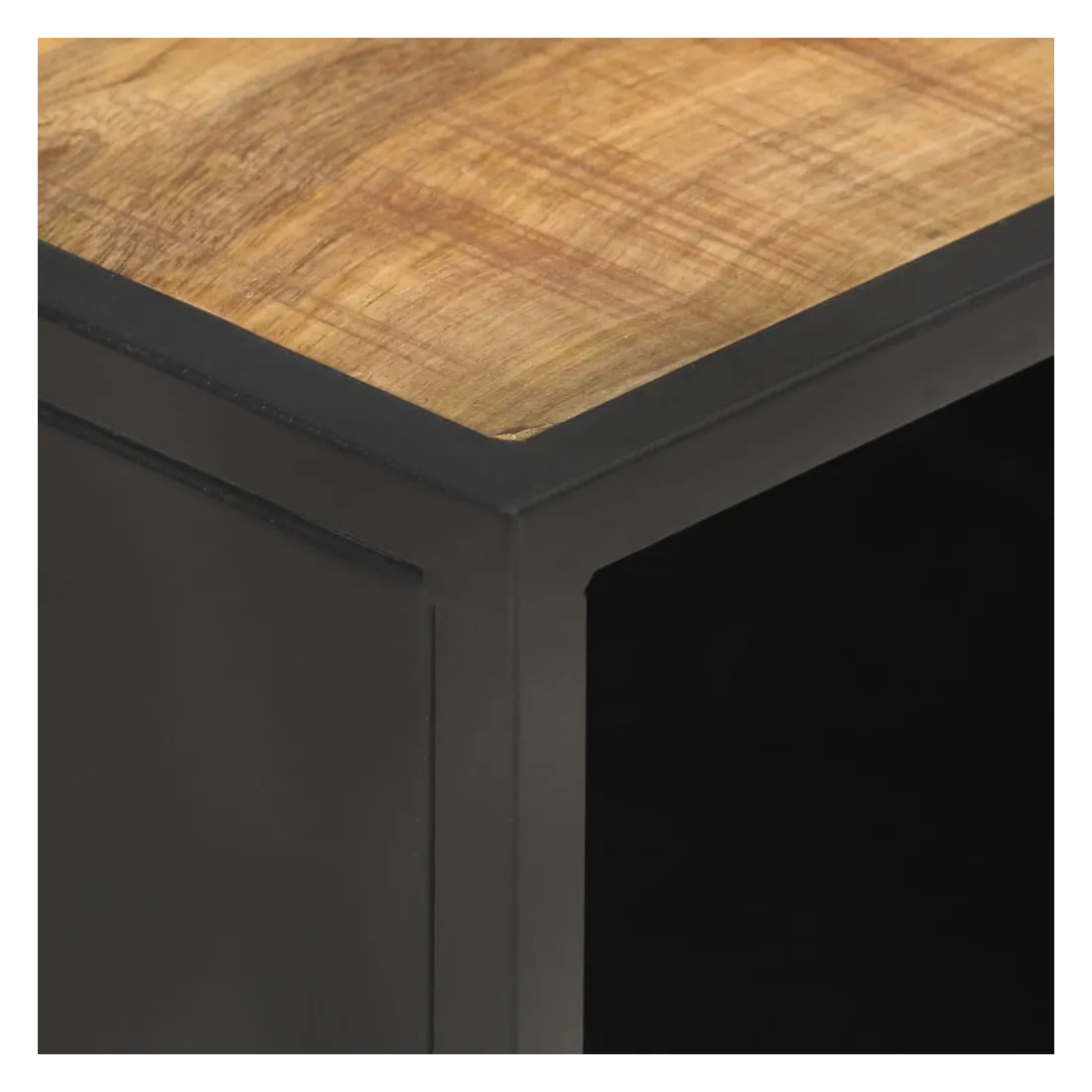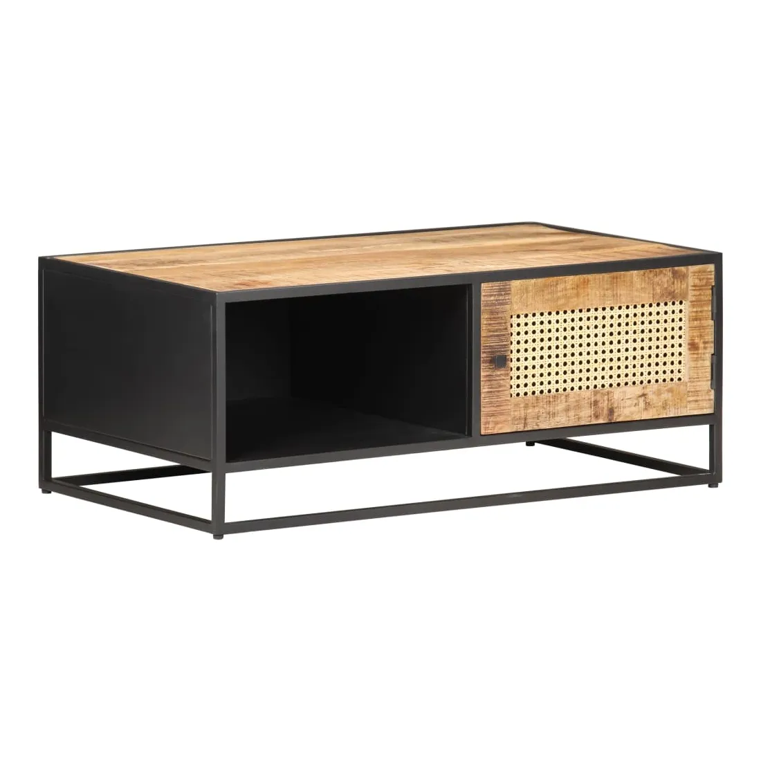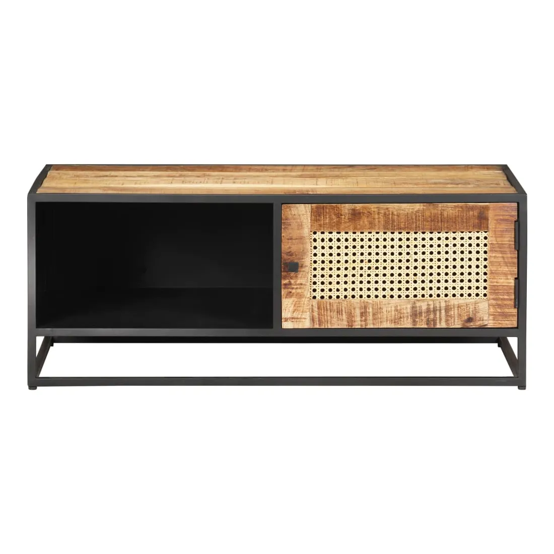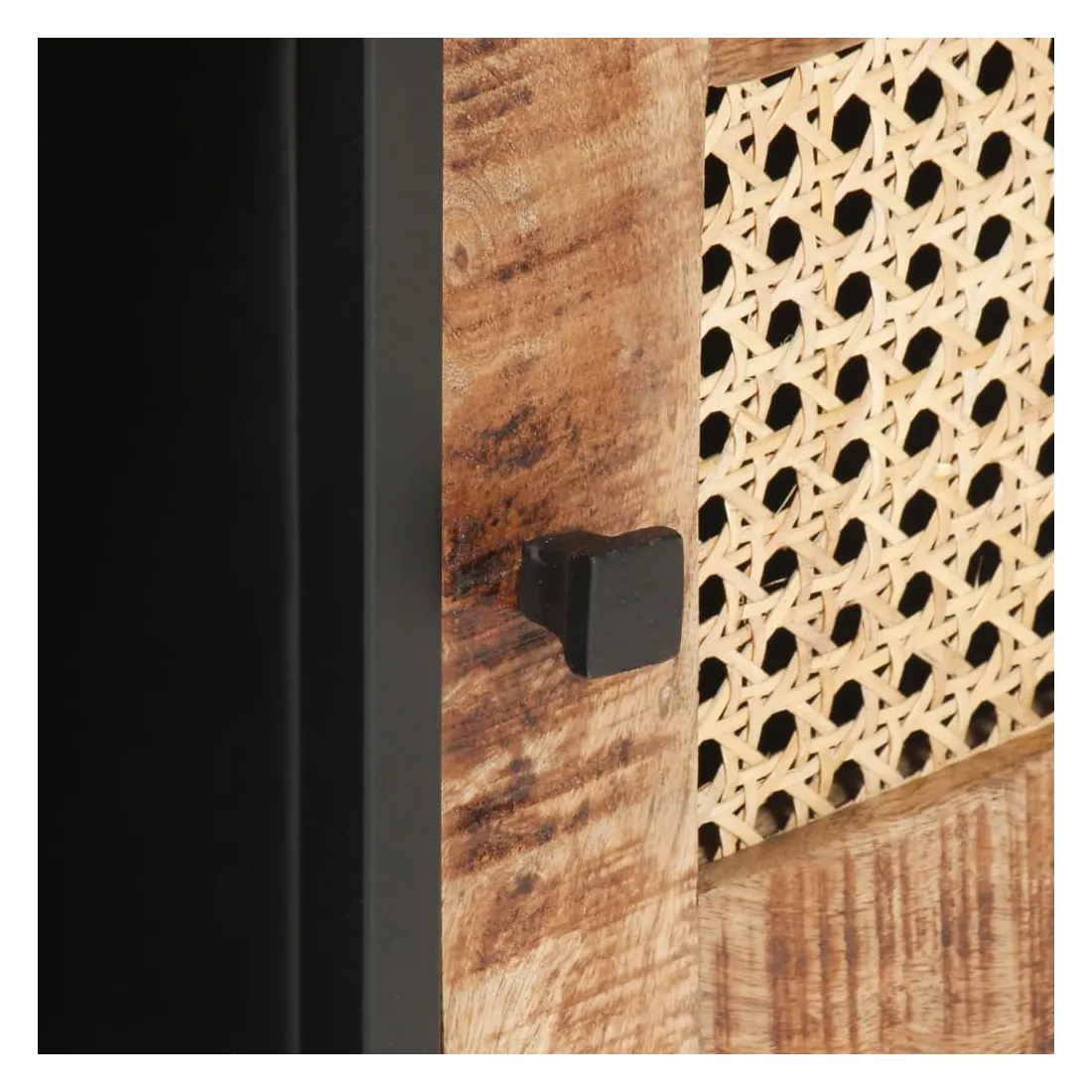 - Matériau : bois massif de manguier brut avec une finition naturelle, canne naturelle, fer avec revêtement en poudre noire