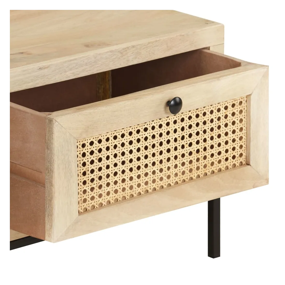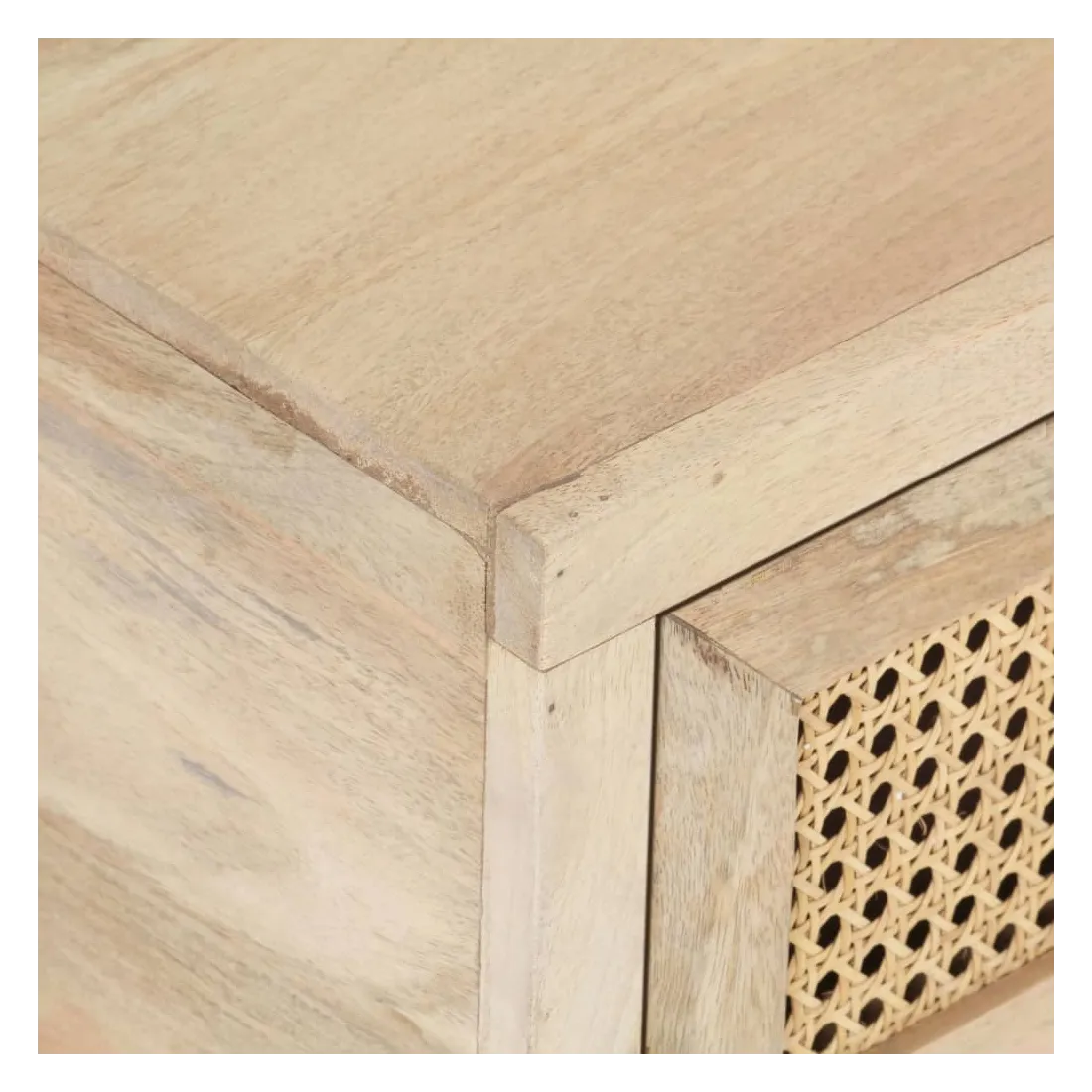 - Matériau : bois de manguier massif avec une finition blanchie, canne naturelle, acier enduit de poudre