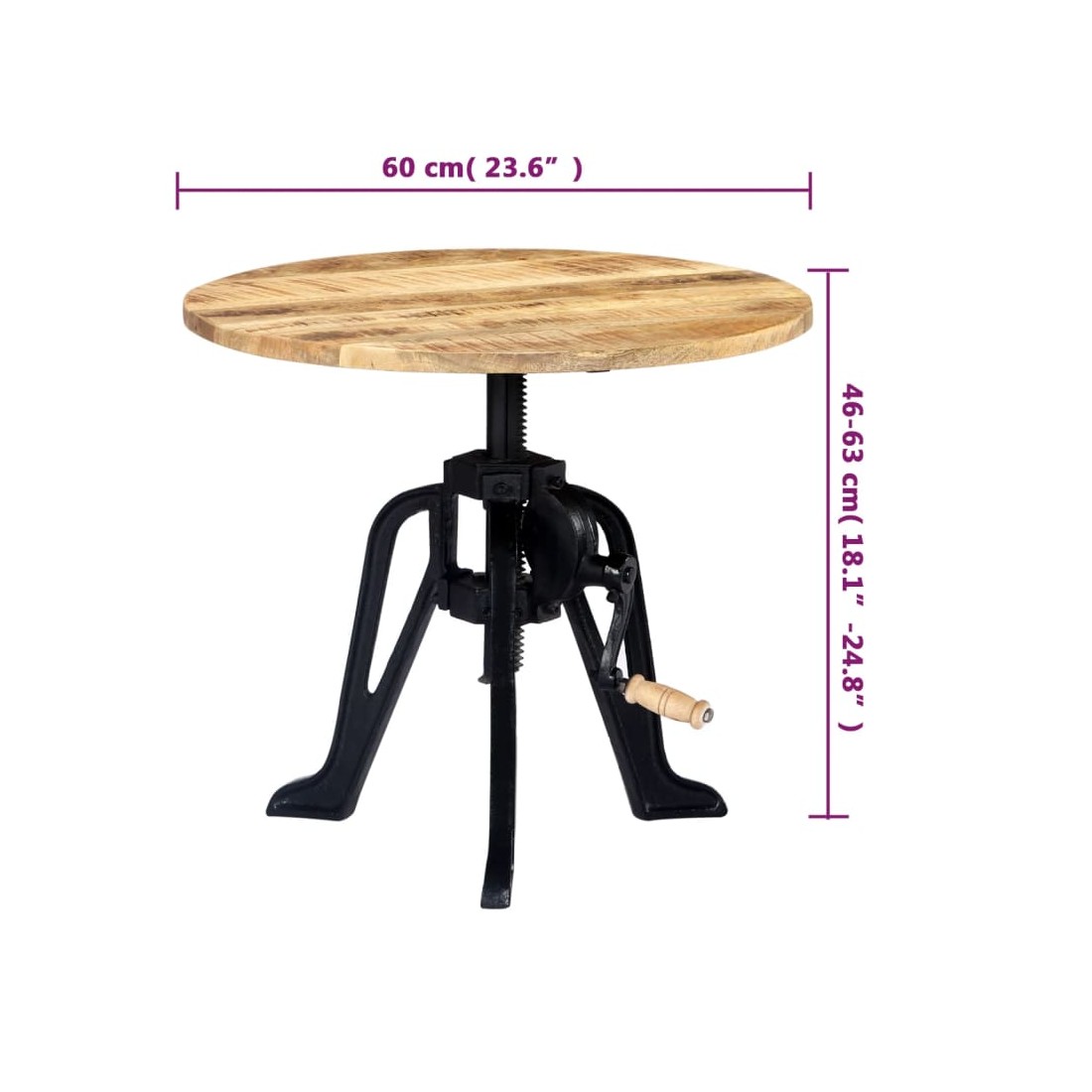 Apportez une touche de charme industriel à votre intérieur avec notre belle table d'appoint en bois ! Cette table d'appoint est fabriquée en bois de manguier solide, ce qui la rend extrêmement stable et durable. Le bois de manguier est un bois dur dense et robuste qui a des belles stries et des contours exquis bruns ou dorés sur sa surface. Chaque étape du processus est réalisée avec le plus grand soin, qu'il s'agisse du polissage, de la peinture ou du laquage. La base en fonte ajoute à la stabilité et à la robustesse de la table. De plus, la table en bois est réglable de 46 cm à 63 cm de hauteur pour des usages multiples. Note importante : L'artisanat exquis et les grains de bois gracieux rendent chaque meuble distinctif et légèrement différent l'un de l'autre ; la livraison est aléatoire.