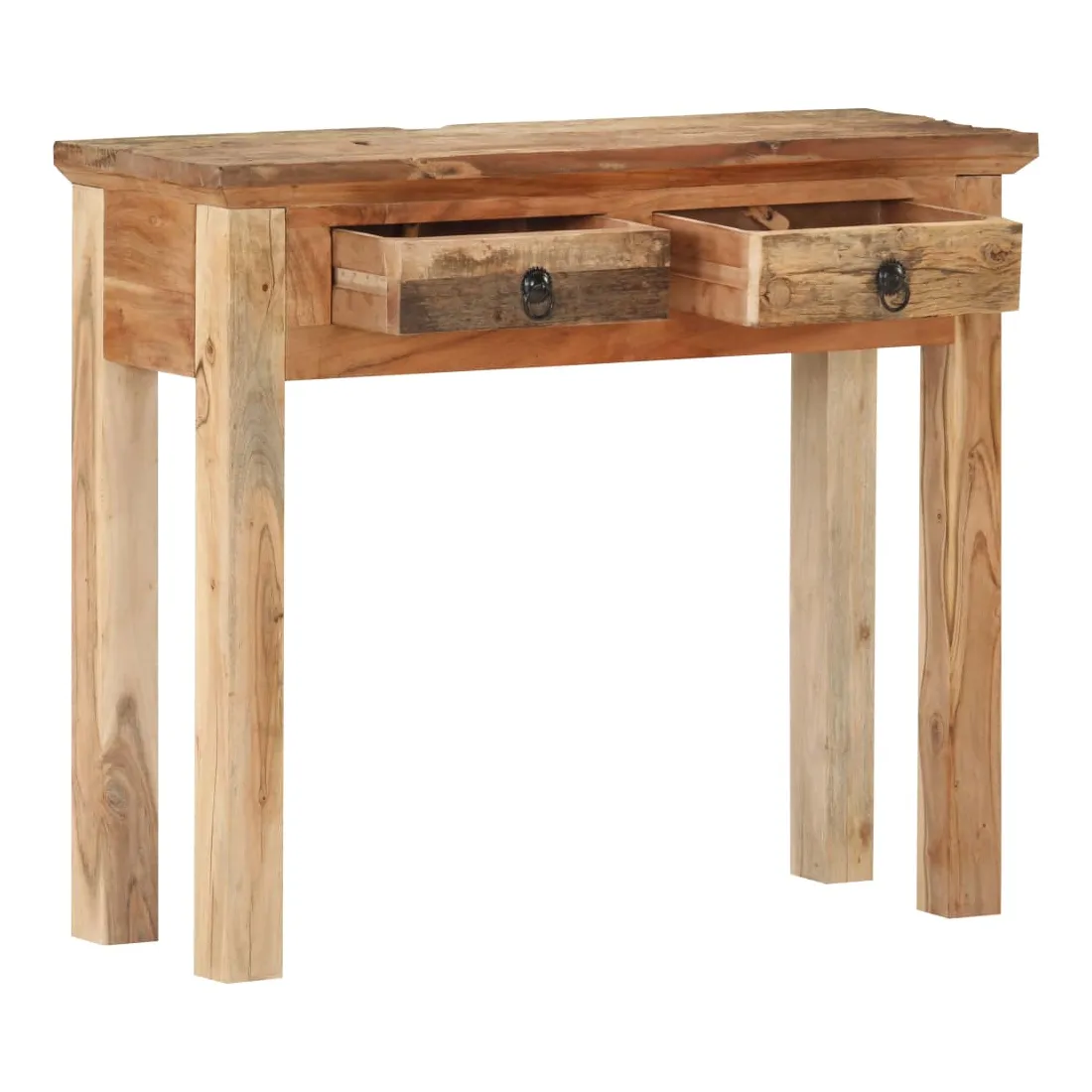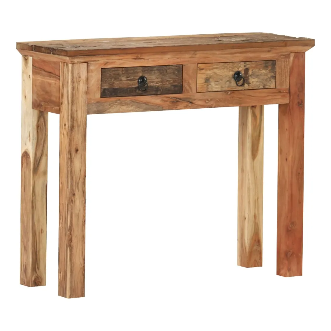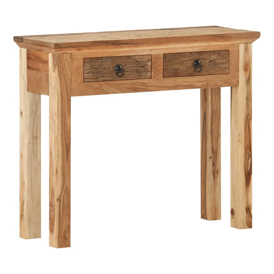 Si vous recherchez une touche de charme rustique à ajouter à votre décoration intérieure, cette table console en bois est pour vous. Cette table d'entrée est faite de bois d’acacia massif et de récupération massif. Le bois de récupération provient de solives, de planchers et de poutres de soutien de vieux bâtiments démolis. Donc, elle peut se composer de différents types de bois comme le pin, le teck, le chêne, le bois de manguier, l’acacia, etc. Cela signifie également que le bois de récupération conserve les caractéristiques de ces types de bois. Le bois de récupération est déjà vieilli, altéré et séché, donc il ne rétrécit pas ou ne se plie pas. Cette table d'appoint est équipée de deux tiroirs, offrant suffisamment d’espace pour garder divers essentiels bien organisés. Remarque importante : la couleur et les veines du bois peuvent varier d'une pièce à l'autre, ce qui rend chaque table de couloir en bois unique.