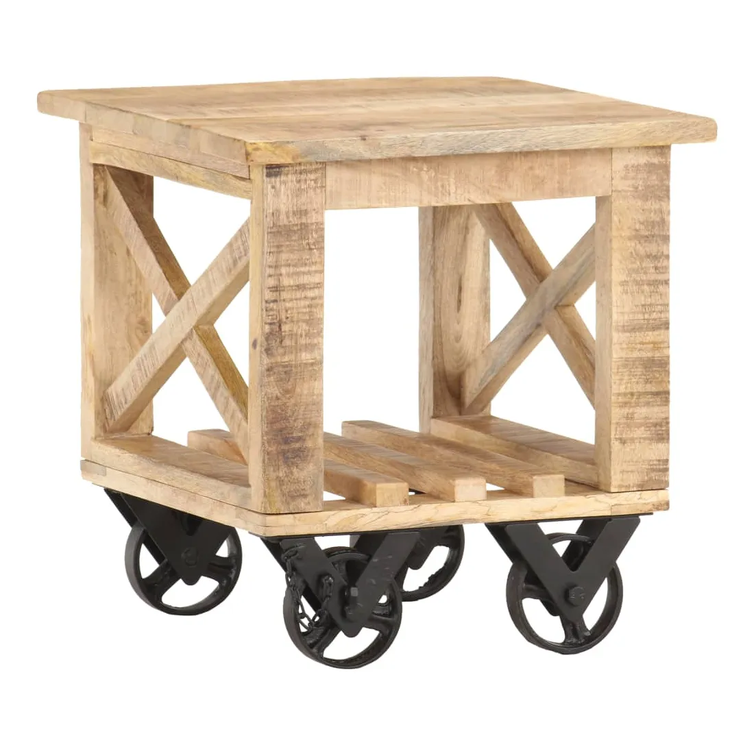 Cette table d’appoint de style vintage se veut un ajout unique à votre décoration. Elle convient également comme table basse, table d’appoint, support pour ordinateur portable, etc. Cette table est faite à la main de bois de manguier massif brut qui est stable, durable et beau. Le savoir-faire artisanal ajoute à son style rétro spectaculaire. Chaque étape du processus est effectuée avec le plus grand soin, que ce soit le polissage ou le laquage. Le savoir-faire artisanal et les belles veines de bois rendent chaque meuble unique et légèrement différent l'un de l'autre. Elle dispose de 4 roulettes pour faciliter le mouvement. L’étagère inférieure vous permet de ranger les essentiels, comme les livres, magazines, etc. Remarque importante : les couleurs varient d'une pièce à l'autre, rendant chacune de nos tables d'appoint unique. La livraison est également aléatoire.