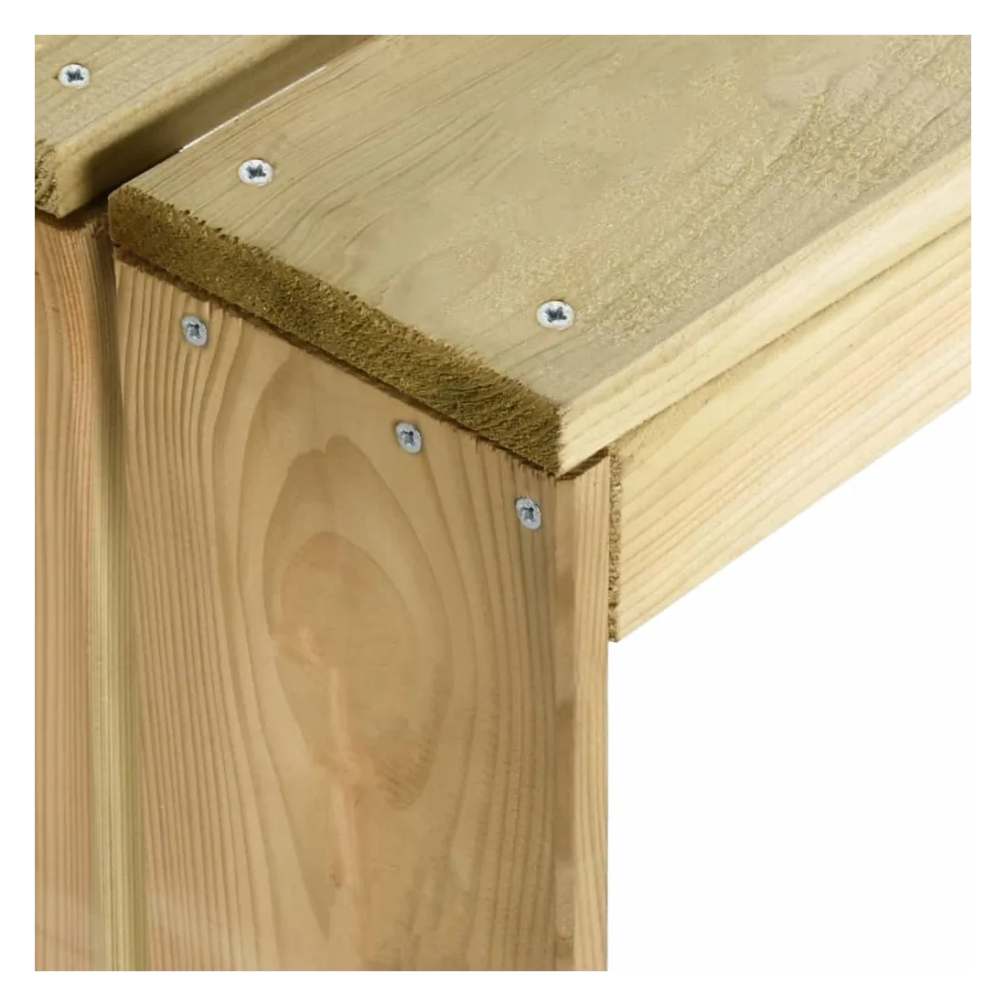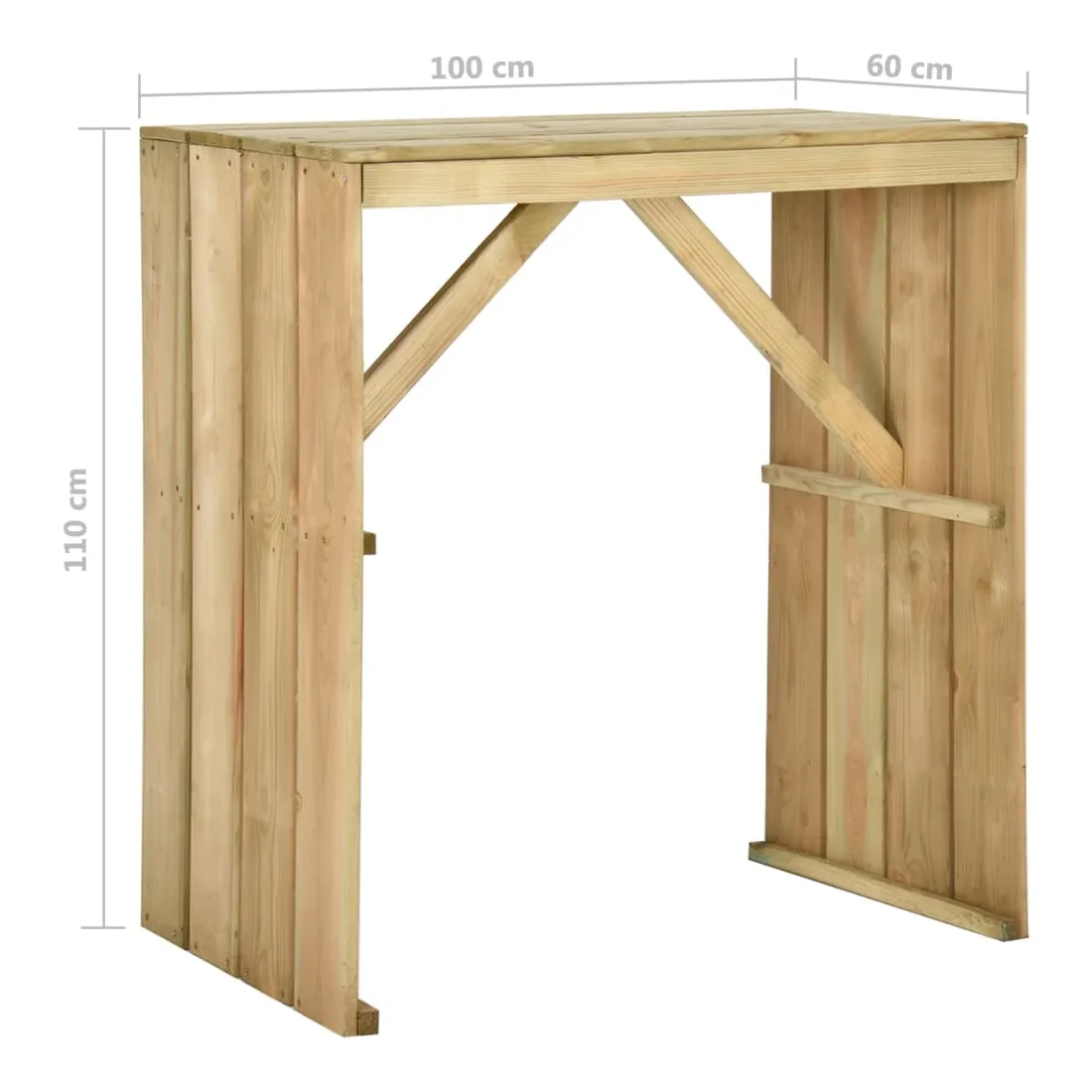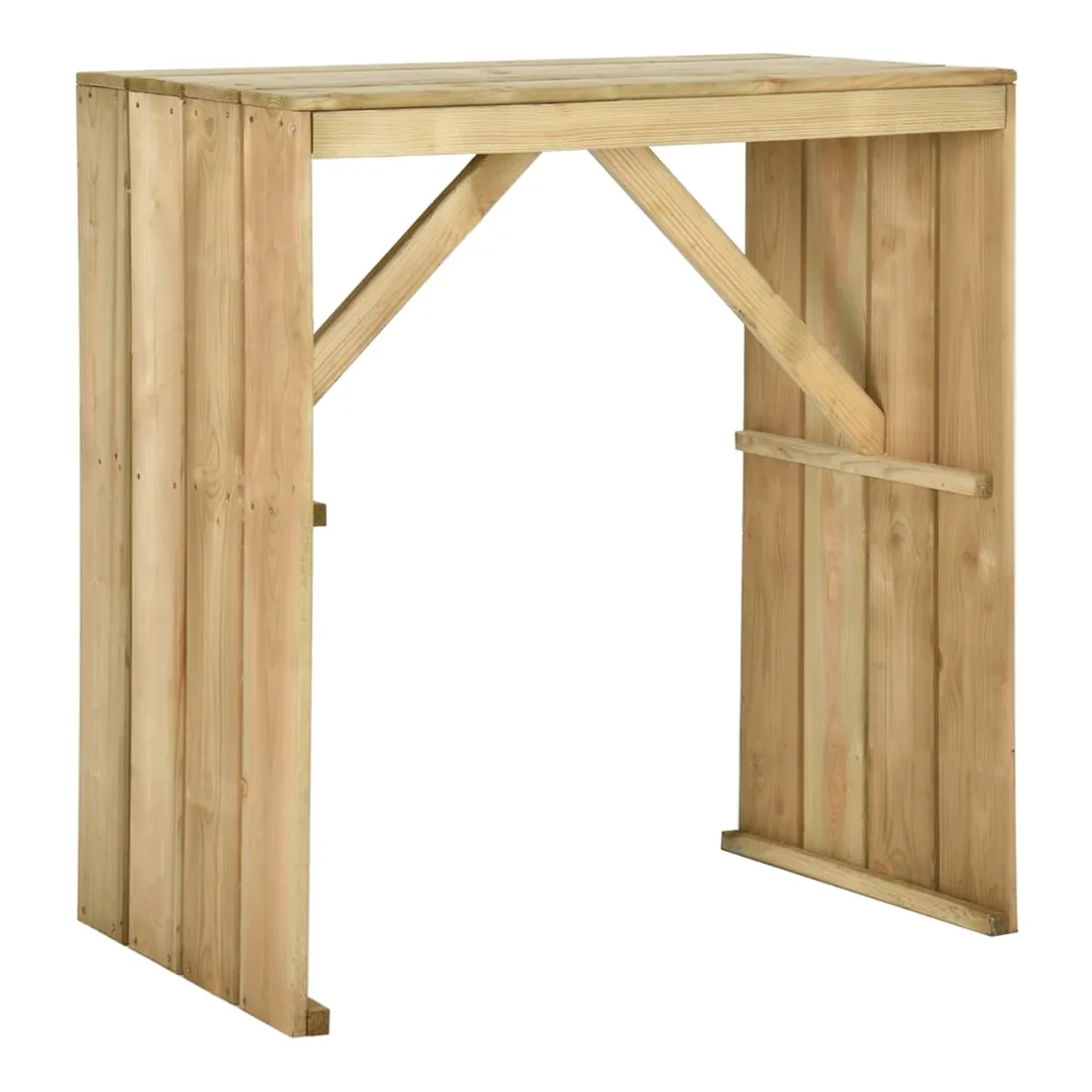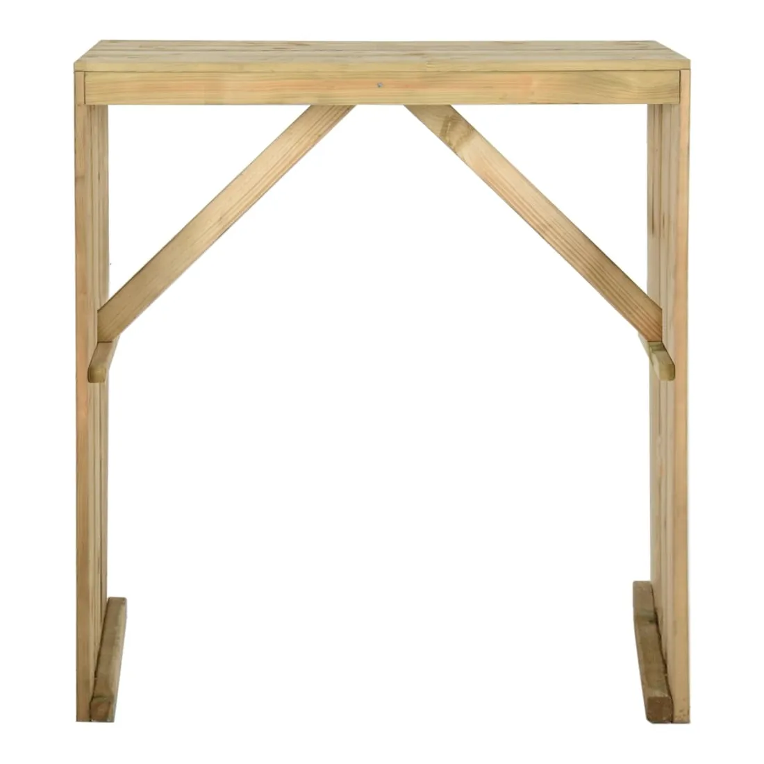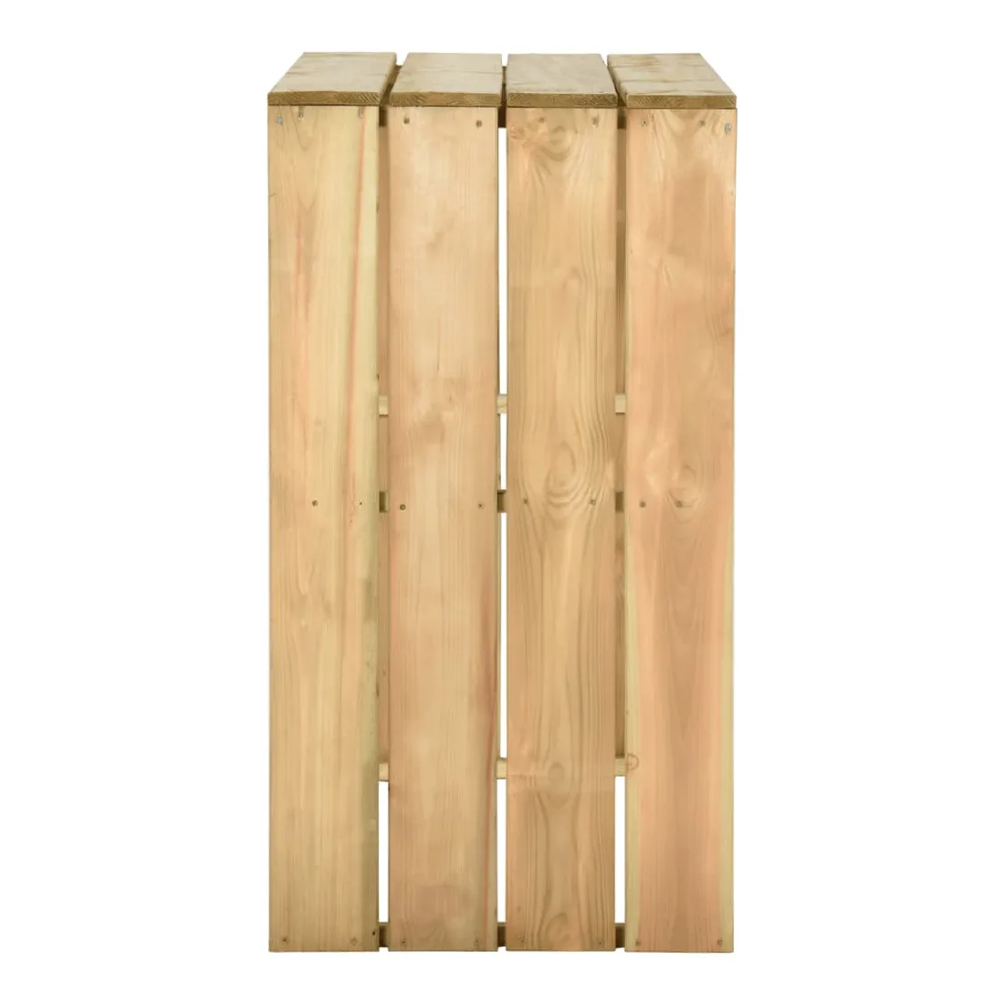 Cette table de bar en bois avec un aspect simple est conçue pour être un excellent supplément à vos espaces extérieurs. Vous pouvez discuter ou prendre un bon repas avec votre famille ou vos amis autour de cette belle table de patio. Matériau robuste et durable : le bois de pin massif est connu pour sa résistance et sa durabilité. Ses grains droits et ses nœuds distinctifs contribuent à son charme rustique. Il a été imprégné avec une solution de conservation et a subi un traitement en autoclave, ce qui renforce sa résistance à la pourriture et aux intempéries.Dessus de table pratique : le dessus de table robuste offre amplement d’espace pour vos accessoires de restauration, ustensiles, nourriture, etc.Design élégant : le design élégant de la table de bar en fait un accessoire intemporel pour votre jardin. Bon à savoir :Pour que vos meubles d'extérieur restent beaux, nous vous recommandons de les protéger avec une housse imperméable.
