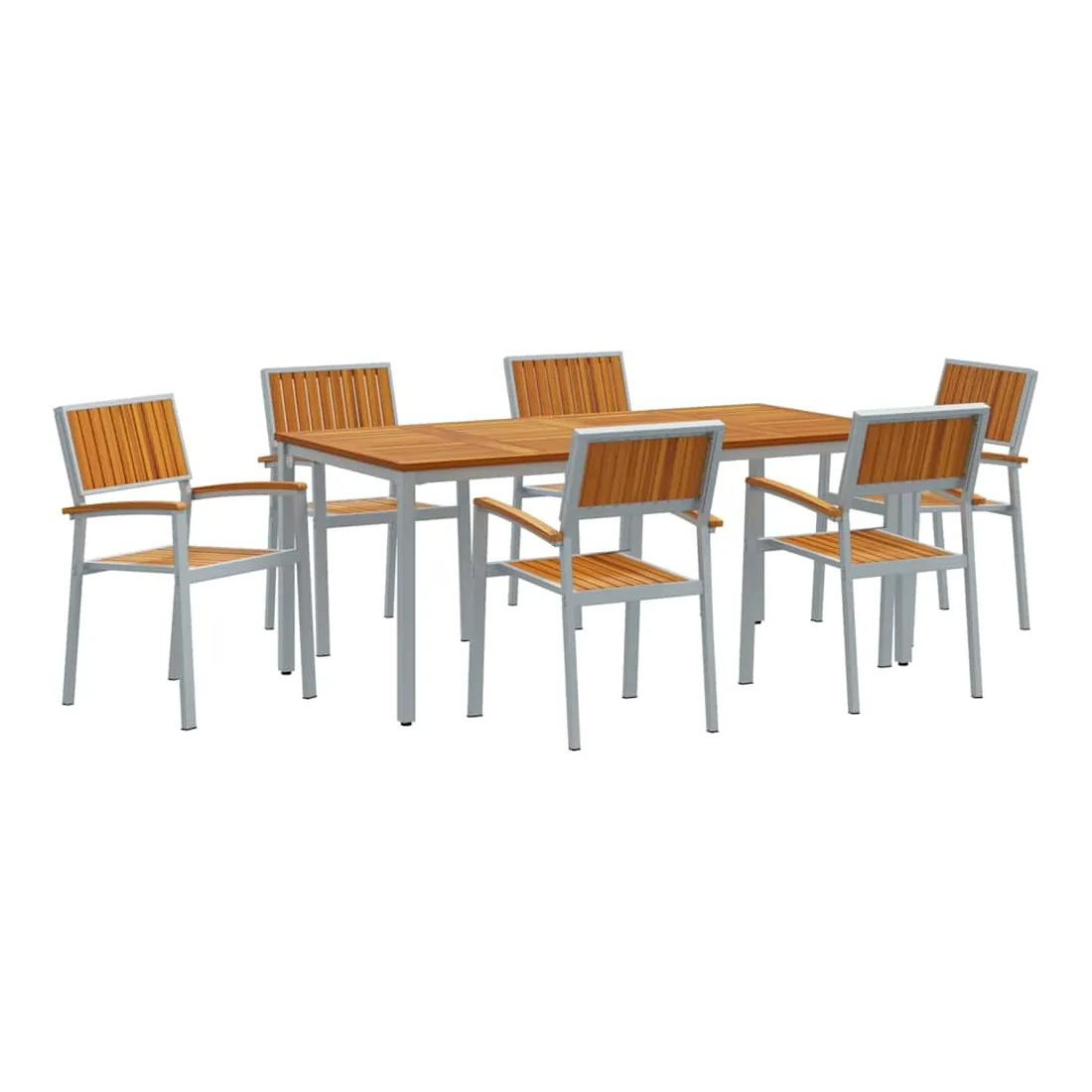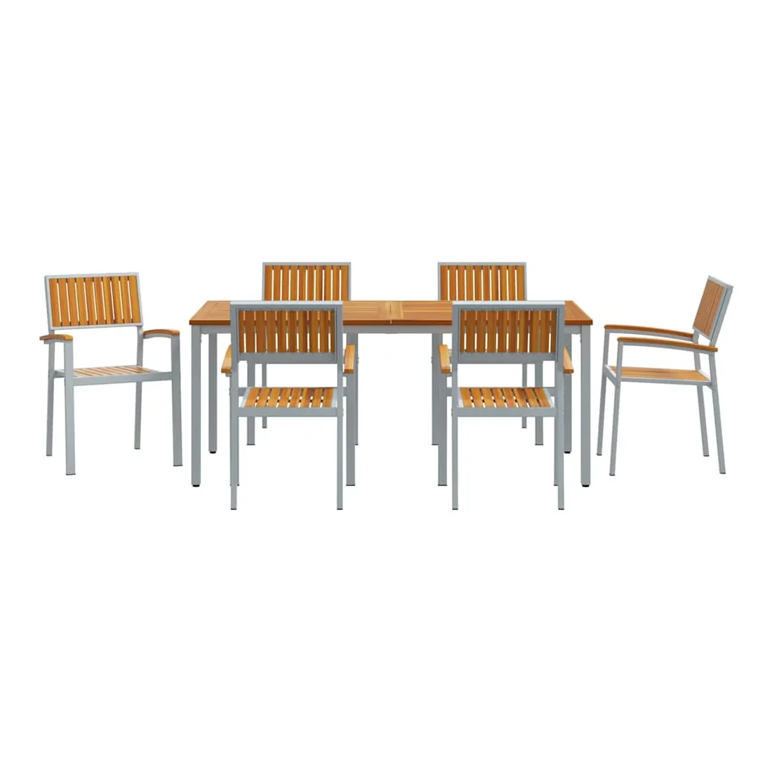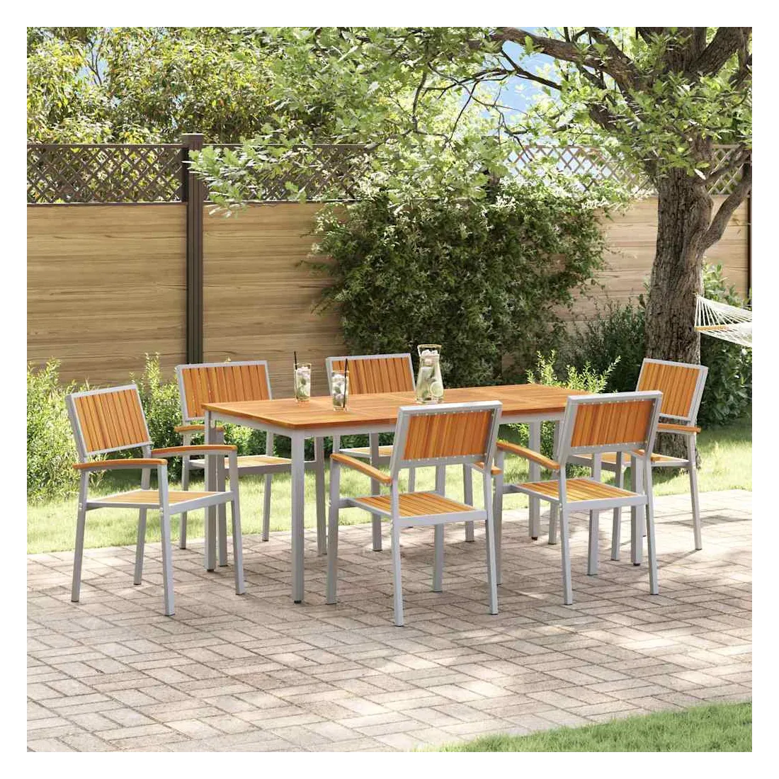 Cet ensemble de salle à manger de jardin est à la fois élégant et pratique, il redéfinit ce que signifie être à l'aise et joli dehors. Avec un style moderne, il affiche sa simplicité et sa fonctionnalité grâce à des lignes épurées qui s'intègrent parfaitement à tout jardin ou terrasse. Fabriqué en bois d'acacia massif et en acier, chaque pièce est conçue pour offrir un charme qui s'accorde avec tous les styles, modernes ou classiques. Que ce soit pour un BBQ d'été, un repas tranquille ou des invités, cet ensemble de salle à manger élève vos moments en plein air sans effort. Matériaux durables: Fabriqué en bois d'acacia massif de qualité, avec une belle teinte brune, ça résiste aux intempéries et à l'usure, parfait pour l'extérieur. Les éléments en acier apportent force et stabilité, assurant que cet ensemble tienne le coup au quotidien tout en restant chic. Accoudoirs et dossier stylés: Chaise avec dossier et accoudoirs en bois d'acacia massif, confort et visuel au rendez-vous. La belle finition rehausse l'apparence, rendant l'assise accueillante et relaxante. Design moderne: Ce look moderne avec des lignes épurées et un style minimaliste apporte une touche élégante à votre extérieur. Son design simple s'associe facilement à différents styles de déco, que ce soit décontracté ou plus chic. Utilisation pratique: Pensé pour être super fonctionnel, cet ensemble de salle à manger se place parfaitement dans les jardins ou sur les terrasses, alliant style et praticité. Sa construction robuste est idéale pour des brunchs tranquilles, des repas en famille ou des soirées entre amis, rendant votre espace extérieur agréable. Entretien facile: Pratique à entretenir, il suffit de passer un coup de chiffon sec pour le garder en bon état. Son entretien minimal garantit qu'il reste beau, vous offrant une belle expérience de repas en extérieur, année après année.