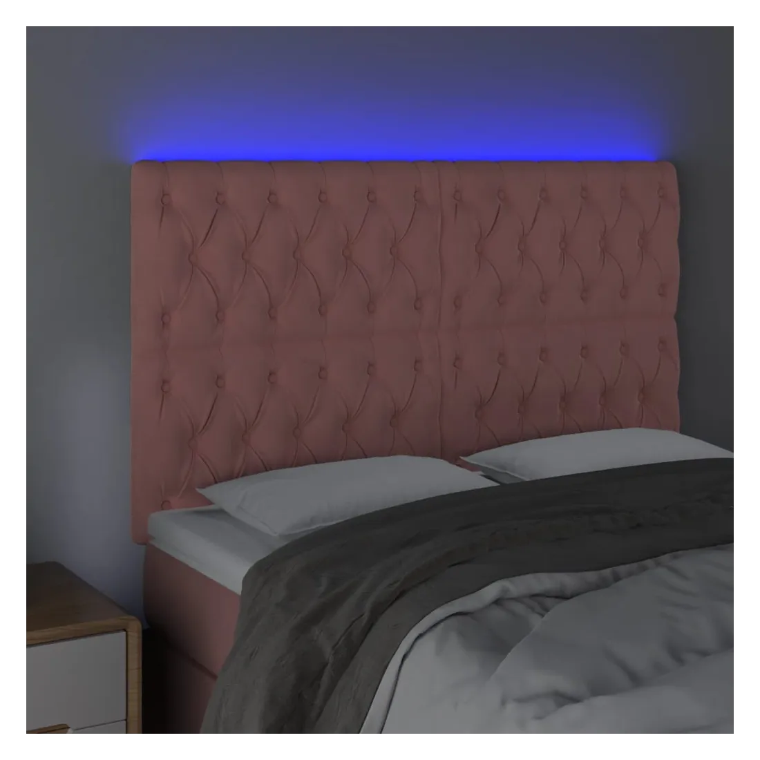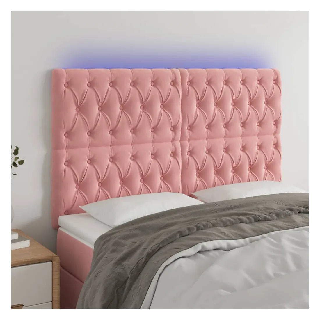 Cette tête de lit à LED classique, au design élégant, donne à votre cadre de lit une touche de modernité étonnante et convient parfaitement à toute chambre à coucher. Velours doux : le velours est un tissu doux et luxueux qui se reconnaît à son tas dense de fibres uniformément coupées qui ont une touche lisse. Le tissu en velours présente un toucher doux distinctif, ce qui le rend confortable au toucher.LED colorée : apportez de l'éclairage dans l'obscurité avec des lumières LED colorées !Hauteur réglable : la tête de lit est réglable en hauteur selon vos préférences.Excellent soutien : la tête de lit vous offre un excellent soutien du dos lorsque vous êtes assis dans votre lit pour lire ou regarder la télévision.Bande à LED découpable : cette bande à LED flexible peut être ajustée en longueur. Le symbole des ciseaux indique où la bande peut être coupée en toute sécurité sans l'endommager. Remarque :Seule la partie avec un symbole de ciseaux peut être coupée et seule la partie avec l'USB continuera à fonctionner comme avant.Chaque produit est livré avec un manuel de montage dans la boîte pour un montage facile.Ce produit est doté d'un connecteur USB, mais la source d'alimentation certifiée de USB 5V n'est pas incluse.