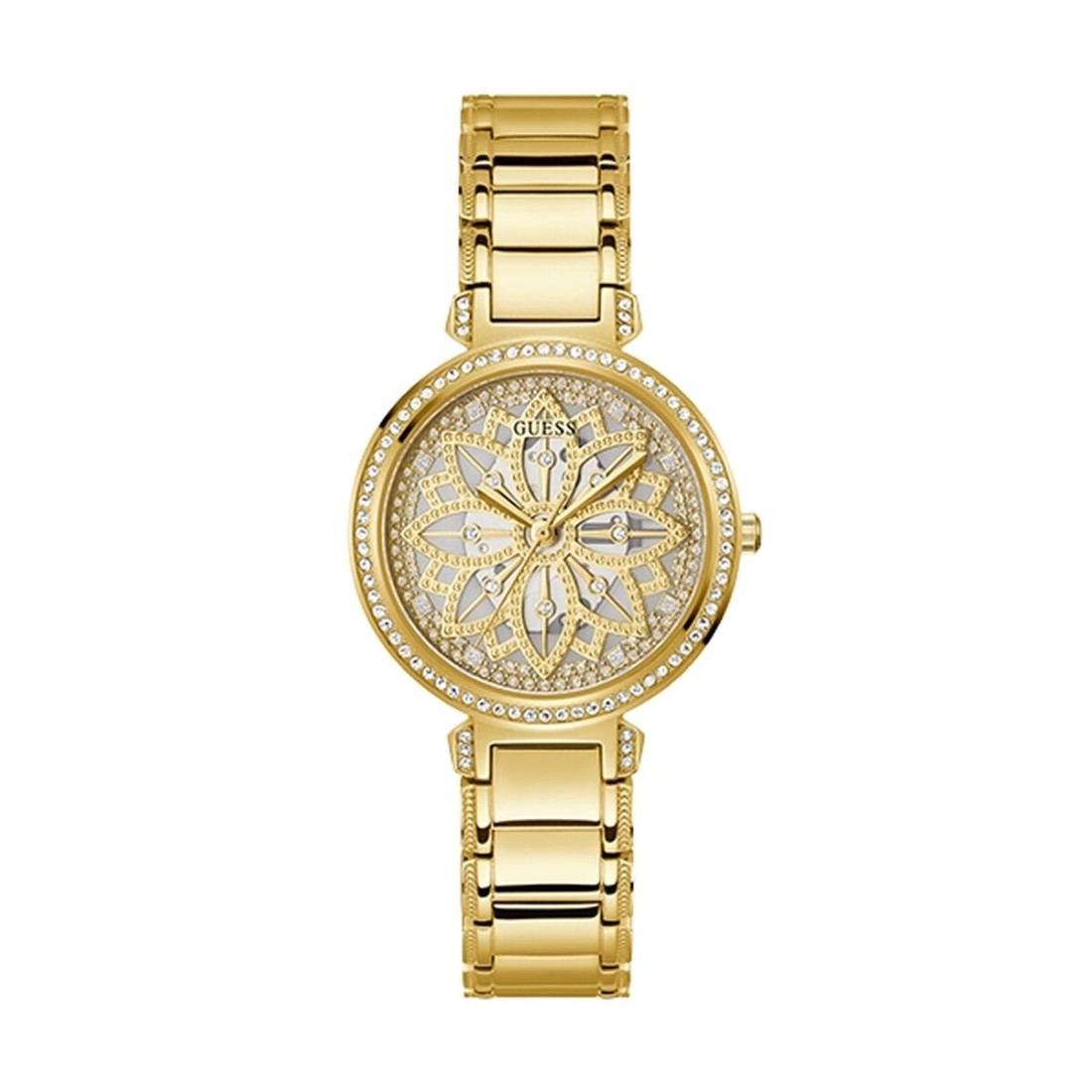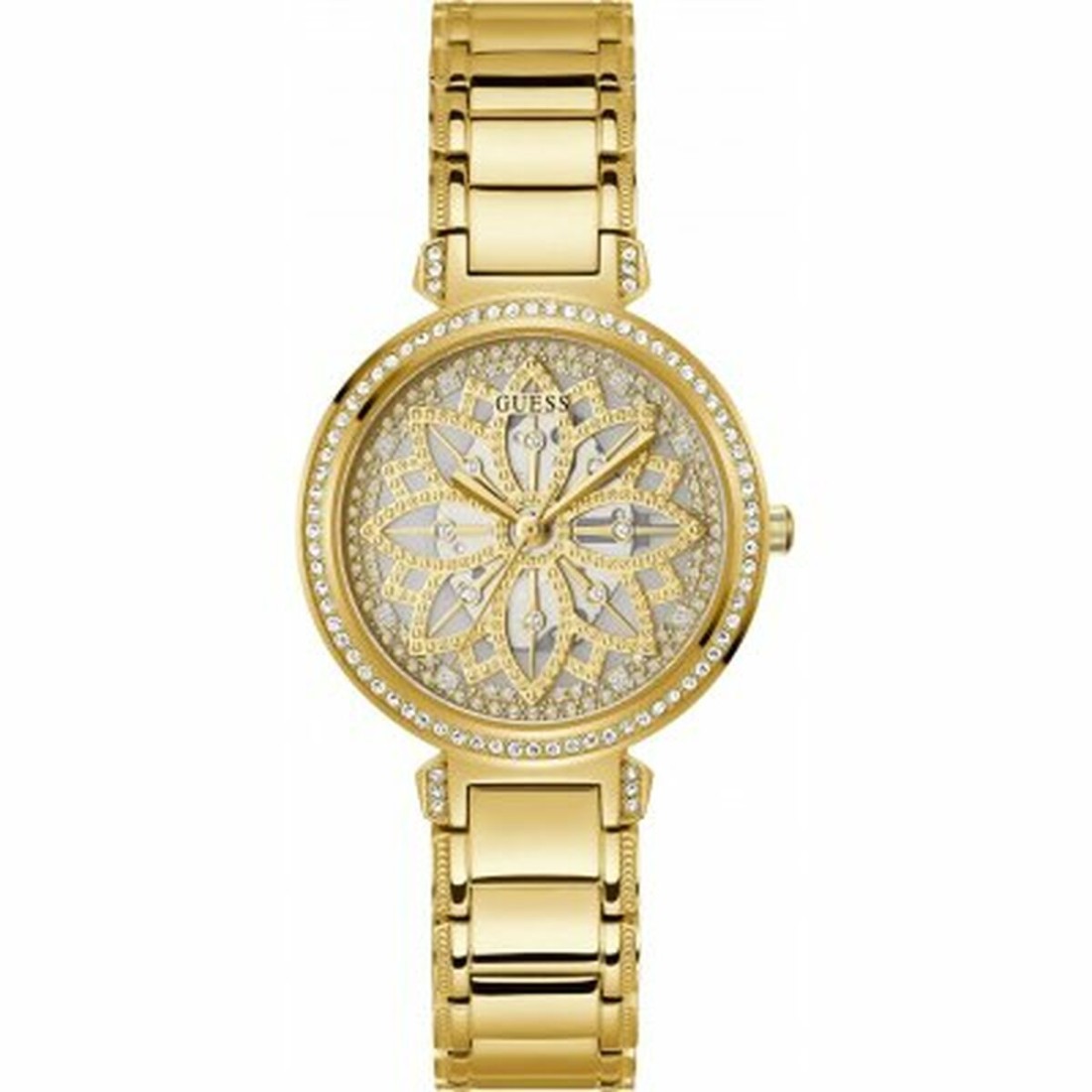 The Guess women's watch is an elegant and sophisticated accessory designed for those who value the perfect blend of style and functionality. It features a gold-tone stainless steel strap that provides durability and a shiny finish, ideal for everyday wear or special occasions. The stainless steel case ensures long-lasting protection for the internal mechanism against shocks and wear. Its gold dial complements the overall look of the watch, offering a uniform and striking appearance that suits various outfits. Additionally, the mineral crystal covering the dial offers good scratch resistance and ensures readability in different lighting conditions. This watch is specifically designed for women, incorporating details that highlight femininity without compromising the device’s sturdiness. It combines quality materials with timeless design, perfect for those seeking a distinctive yet practical accessory. Overall, this Guess watch represents a balanced choice for those wanting a reliable and visually appealing product within the female stainless steel and gold-tone watch segment.